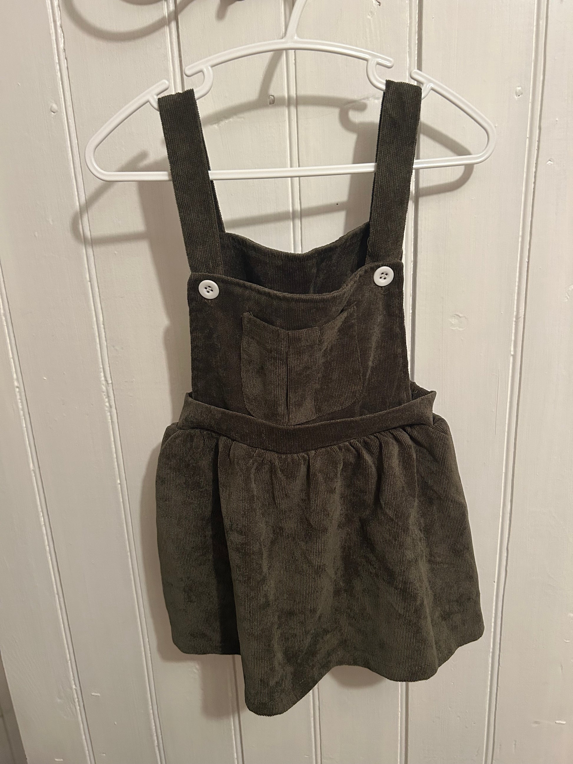 No brand. Ribbed velvet like material skirted overalls. Dark green in colour. Size 12/18m. Brand new condition