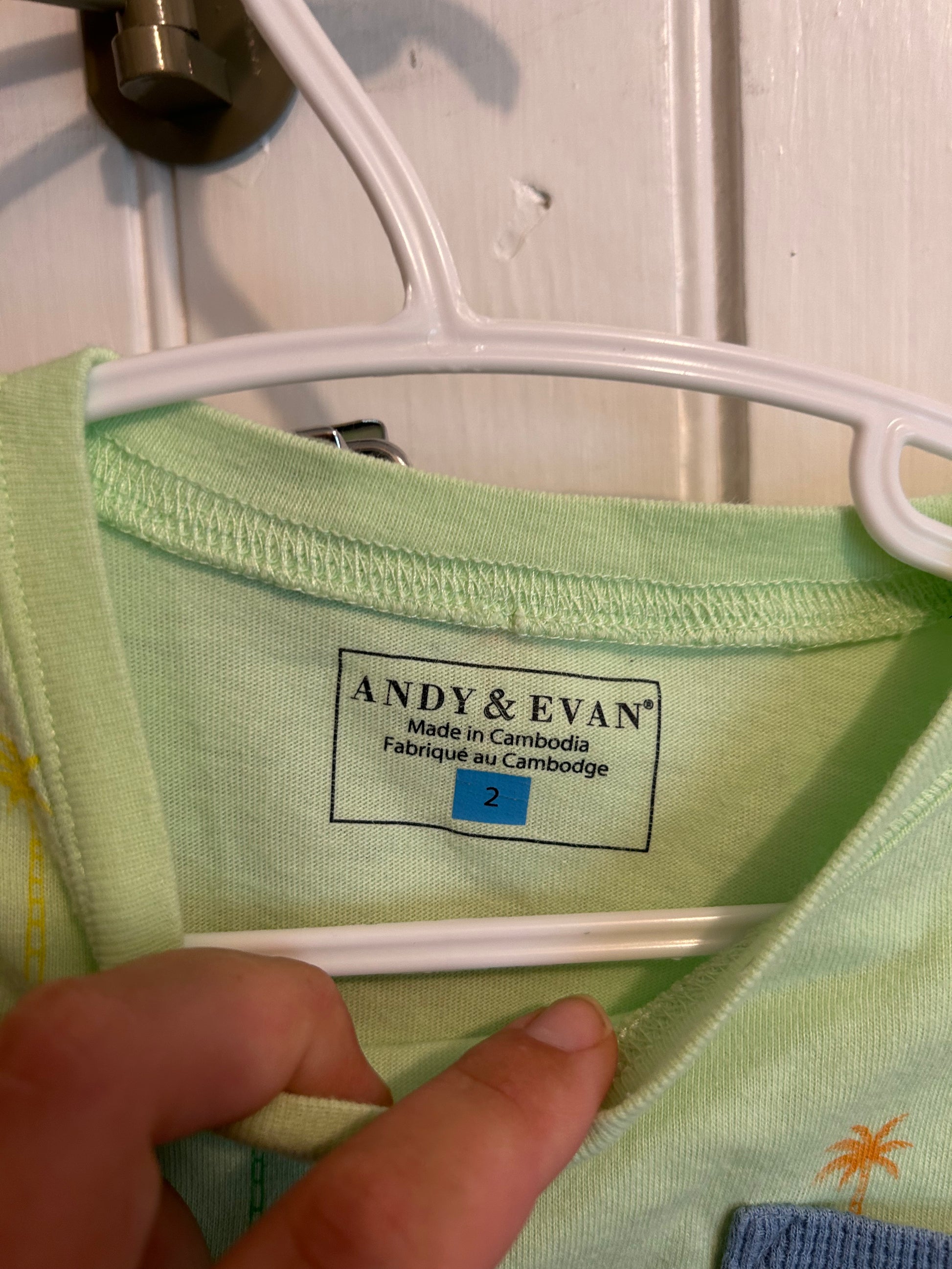 Andy & Evan’s brand. Matching 2pc set of green palm tree top and brown shorts. Size 2t. Brand new condition