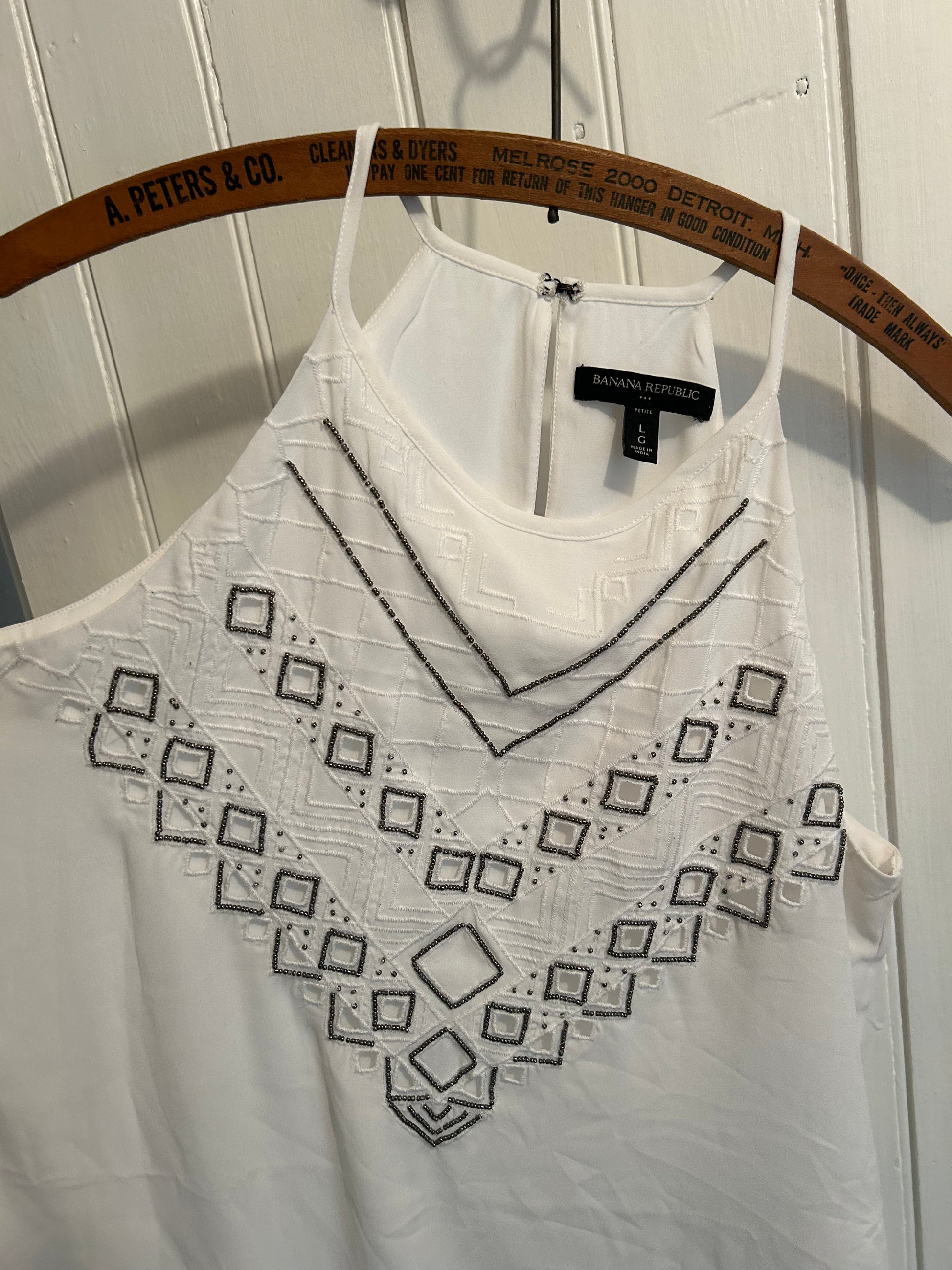 Banana Republic brand. High neck tank blouse. Beaded geometric neckline. White in colour. Size petit large. Brand new condition