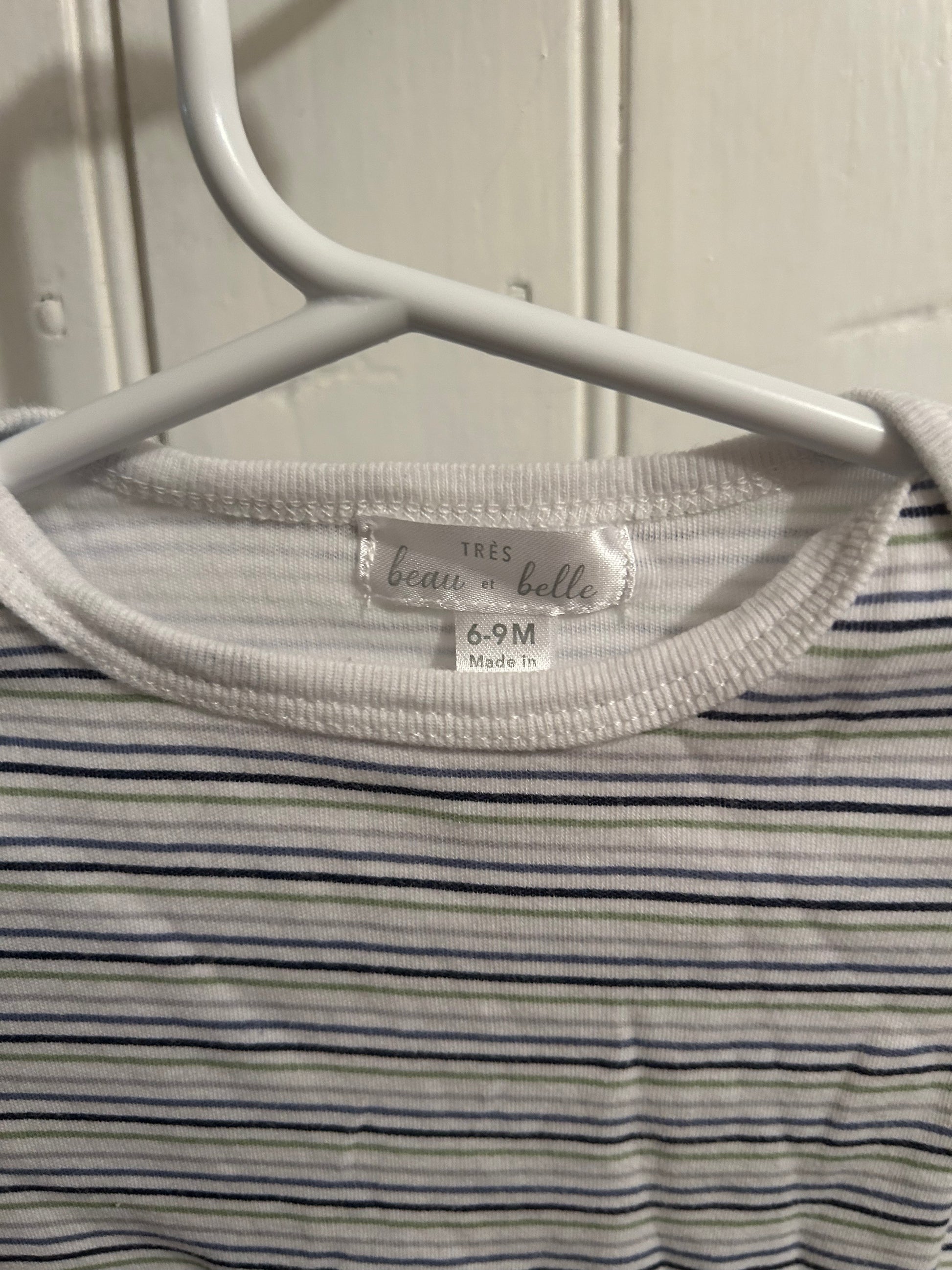 Beau & Bella brand. Long sleeve onesie. White with green & blue stripes. Size 6/9m. Brand new condition