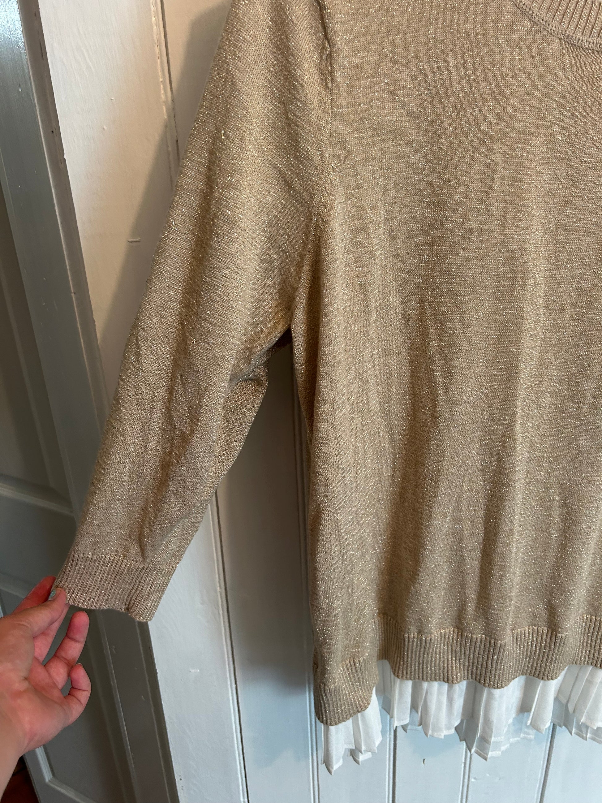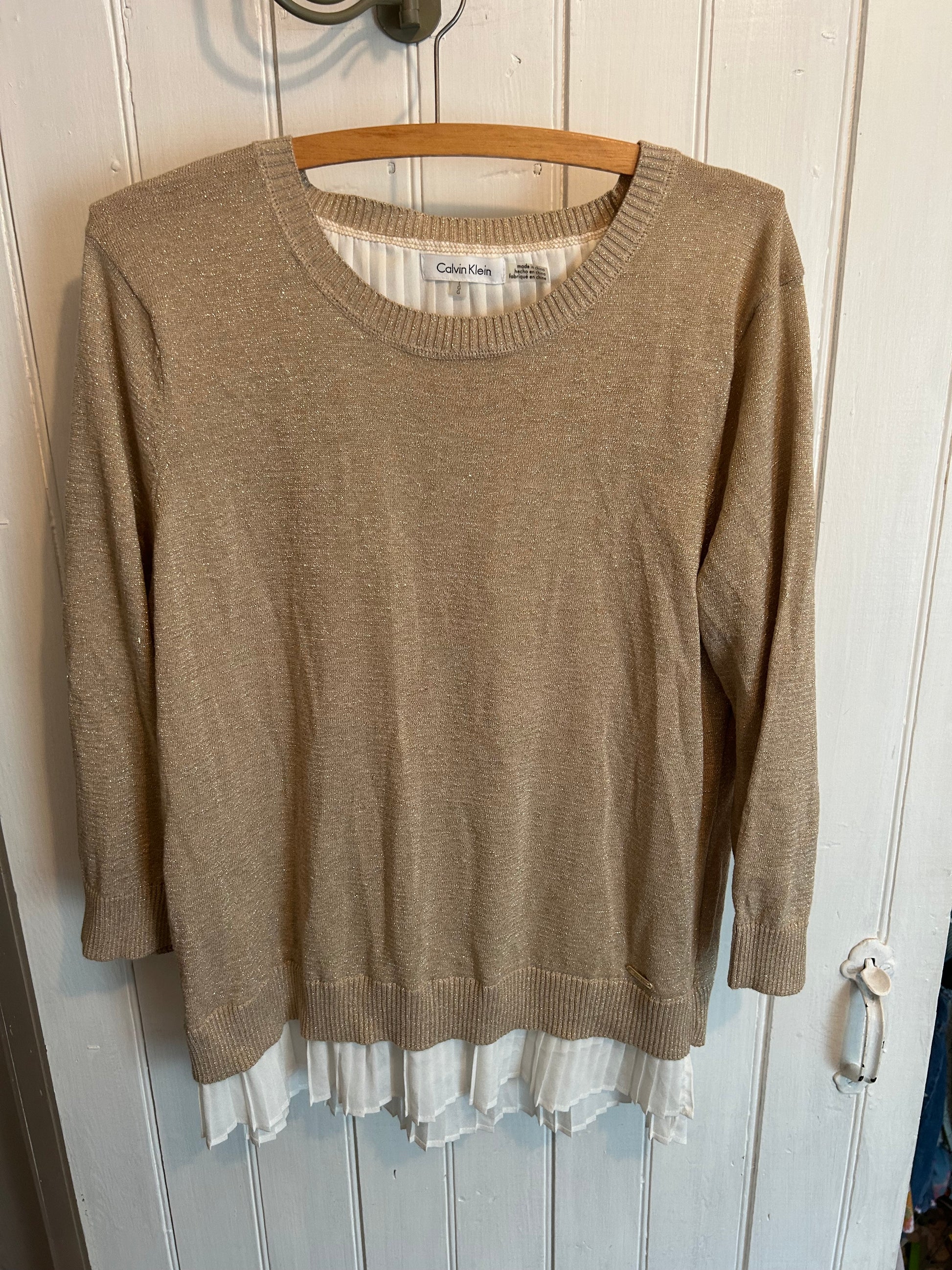 Calvin Klein brand. Pullover light weight sweater with pleated mesh lining. Glittery gold with white lining. Size large. Brand new condition