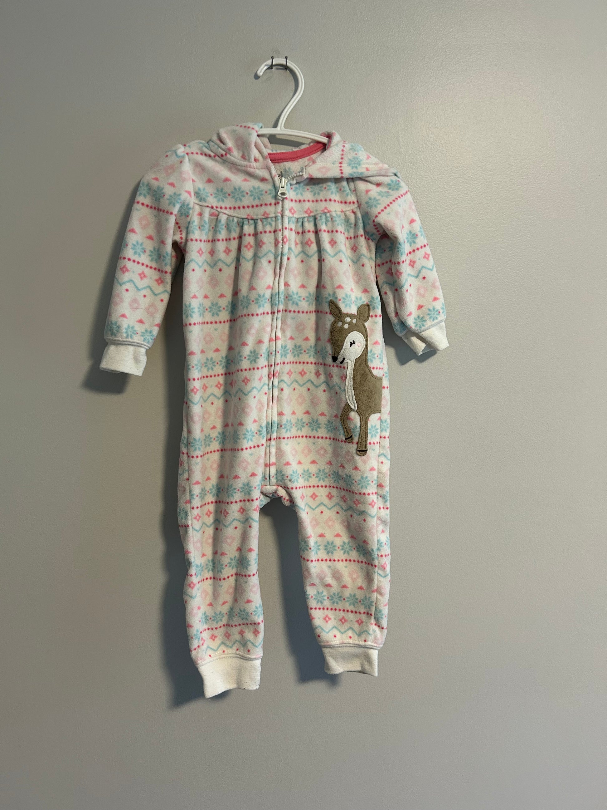 Carters brand. Fleece zip up hooded sweater romper. White with pink and blue Aztec like print. Size 12m. Brand new conditionÂ