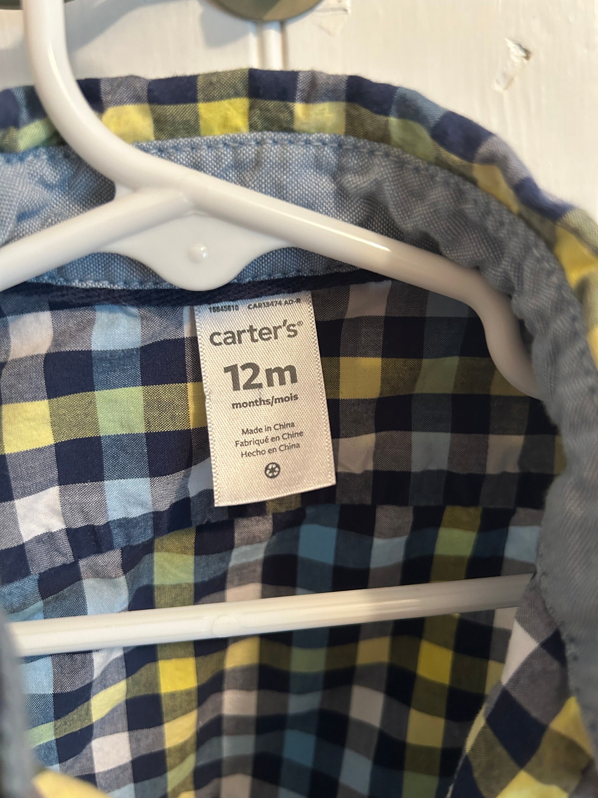 Carters brand. Long sleeve button up flannels. Yellow, blue & white gingham plaid. Size 12m. Brand new conditionÂ