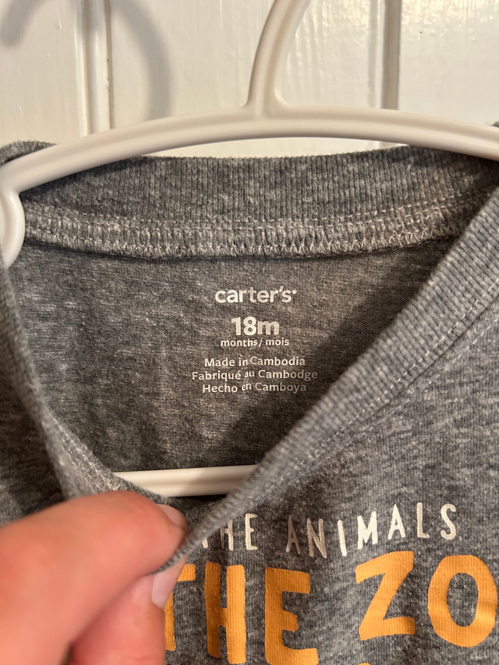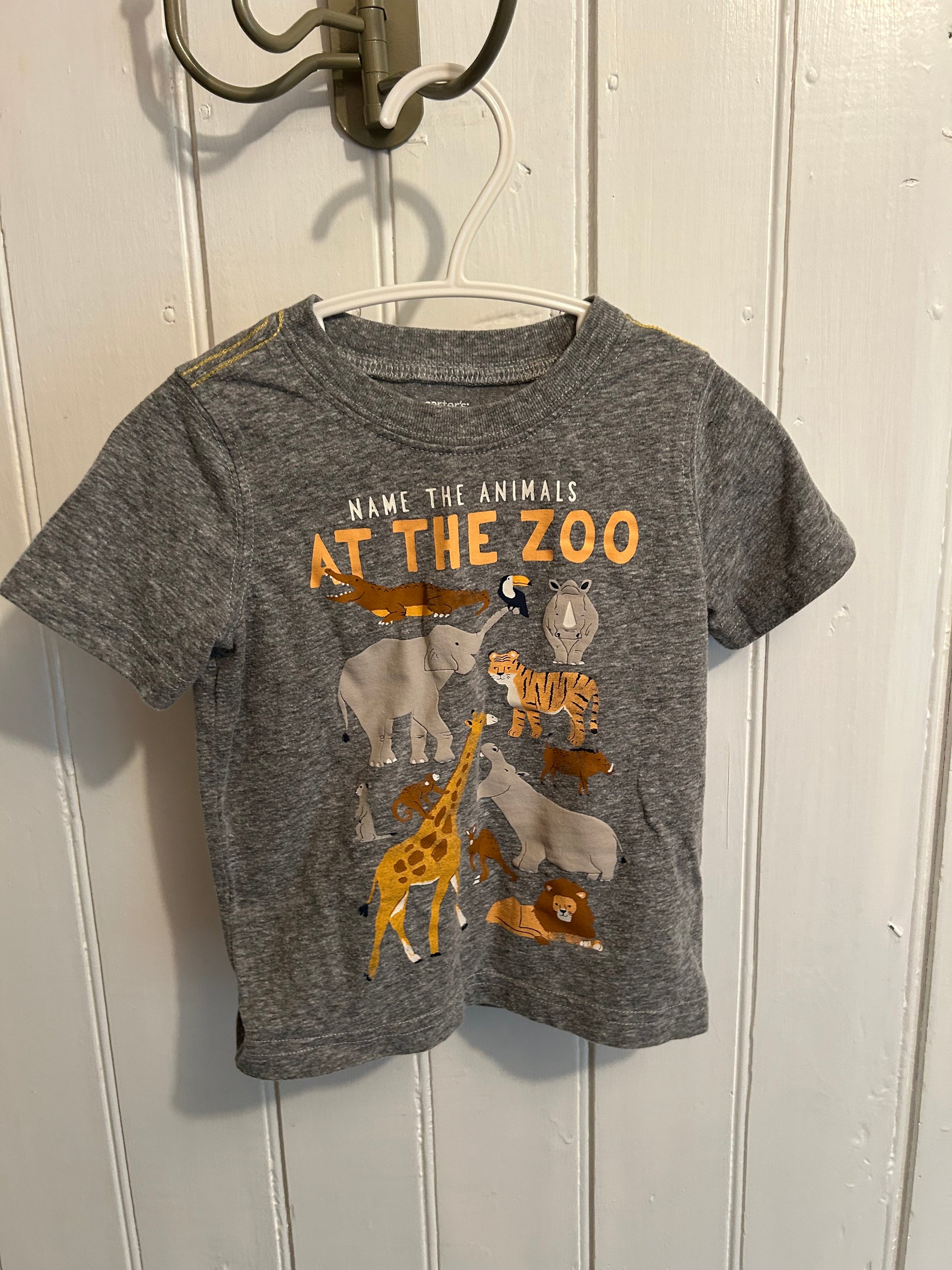 Carters brand. Short sleeve graphic T-shirt. Grey with zoo animal graphic. Size 18m. Brand new conditionÂ