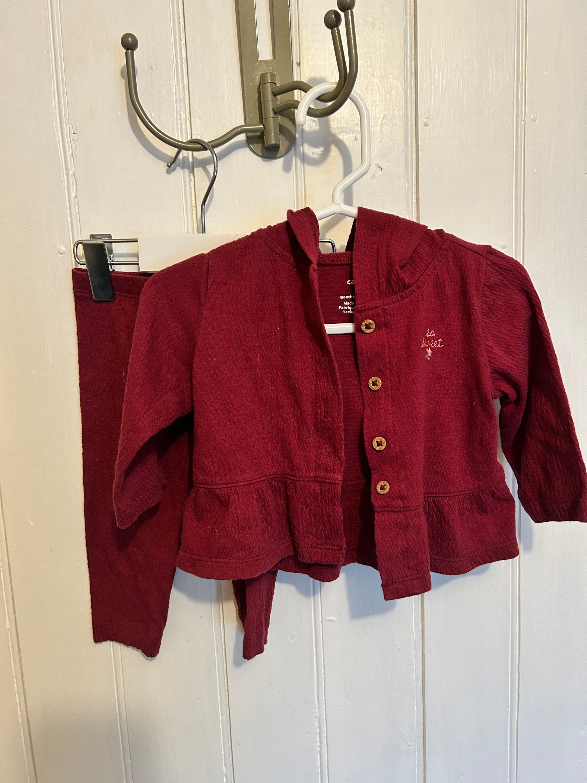 Carters brand. Long sleeve button up hooded peplum & leggings. Burgundy in colour. Size 6m. Brand new conditionÂ