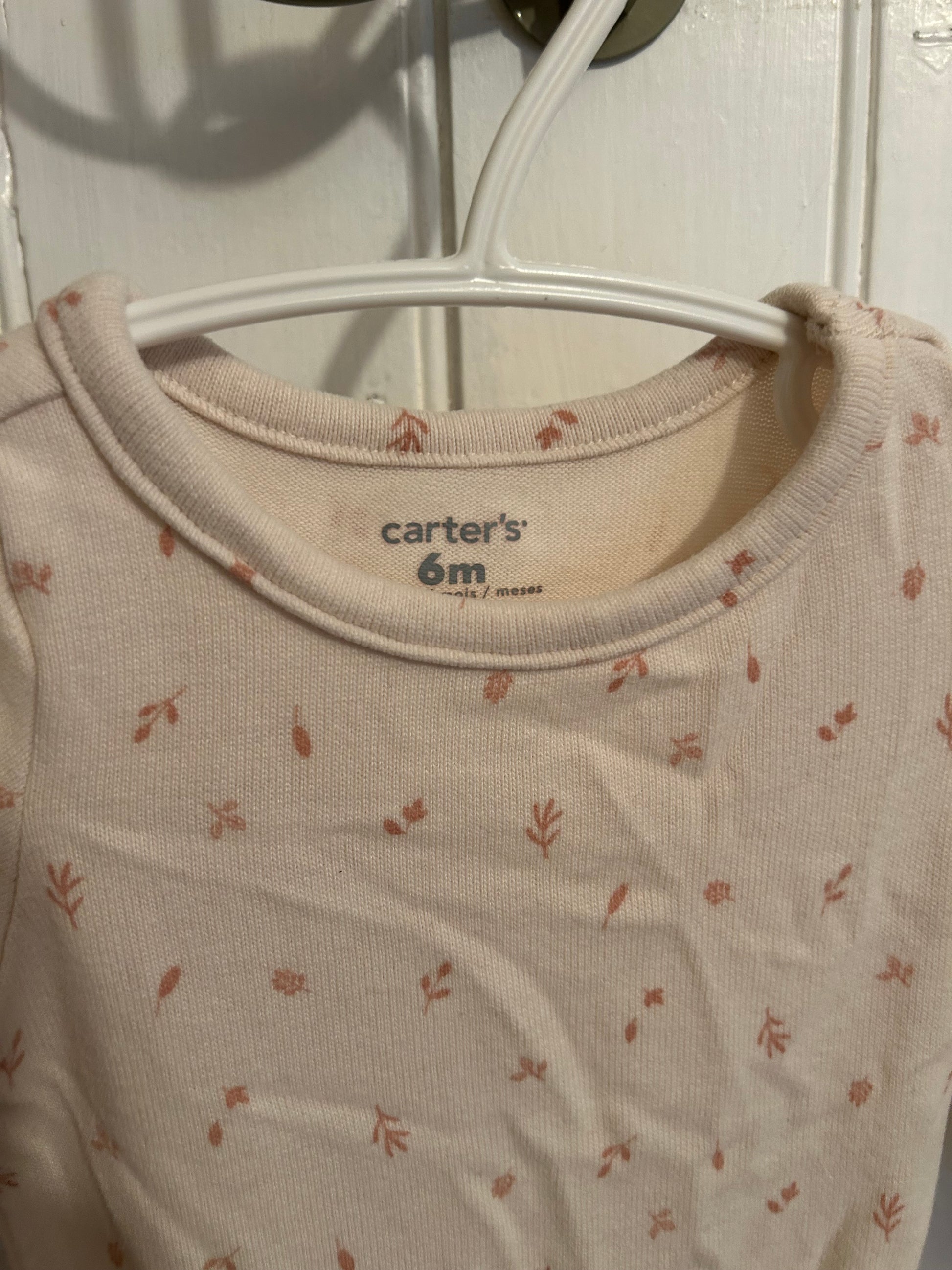 Carters brand. Long sleeve onesie, soft knit material. Off white with light pink floral. Size 6m. Brand new conditionÂ