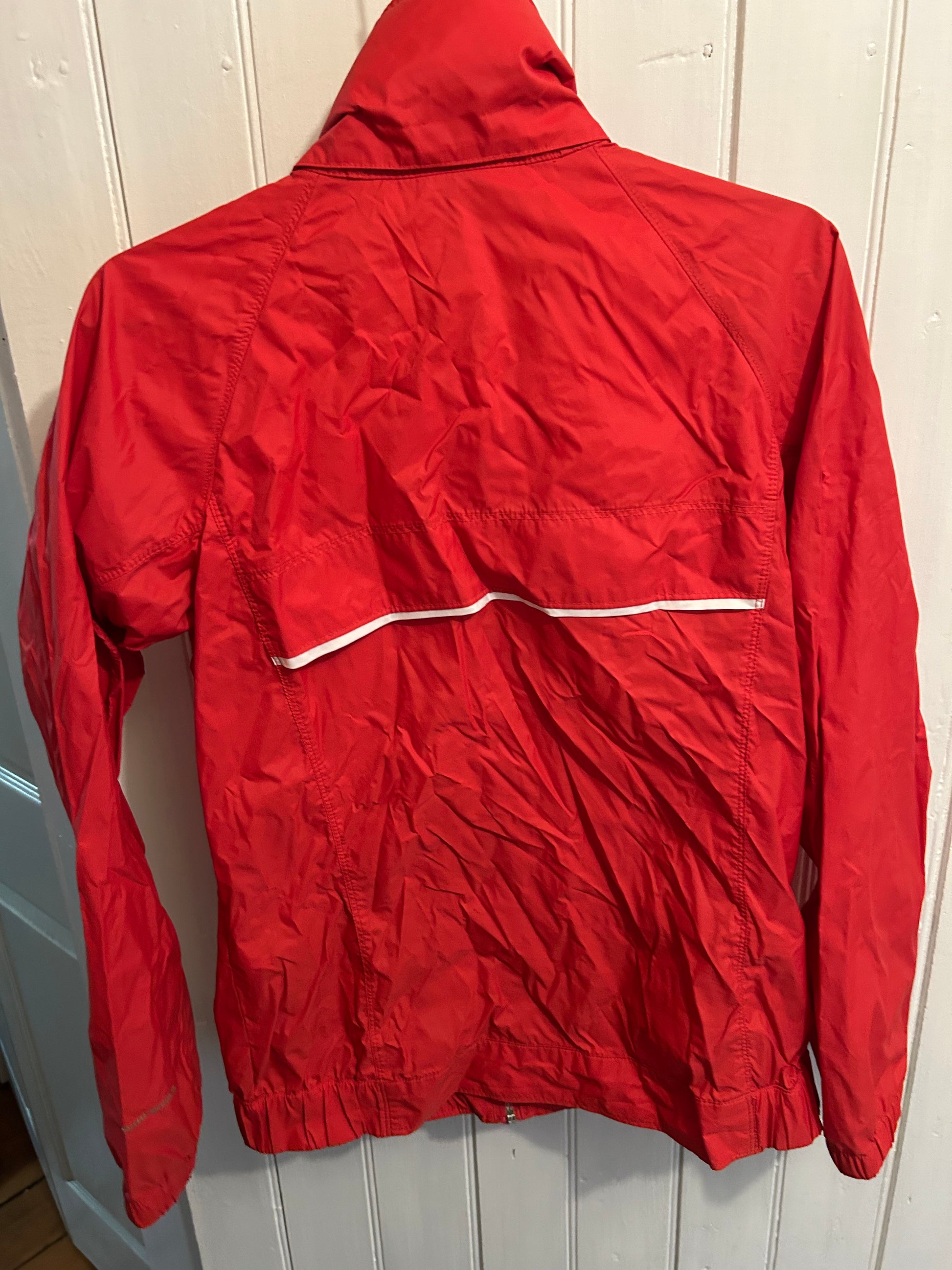 Columbia brand. Unlined zip up rain jacket. Hood is rolled into collar. Omni heat. Red in colour. Brand new condition