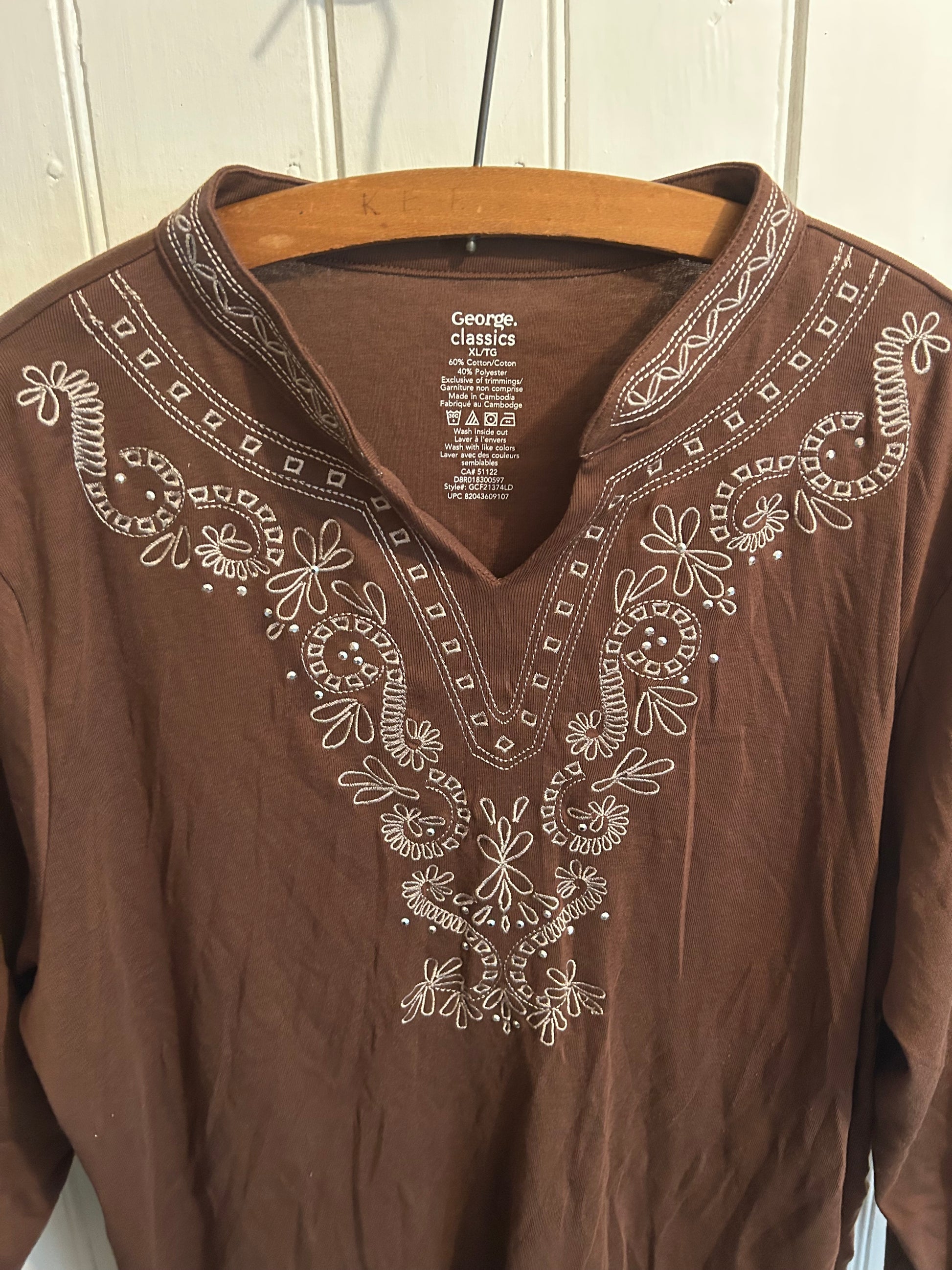 George brand. Long sleeve vneck top. Brown with embroidered neckline, reminds me of a cowboy boot stitching! Size xl. Brand new condition