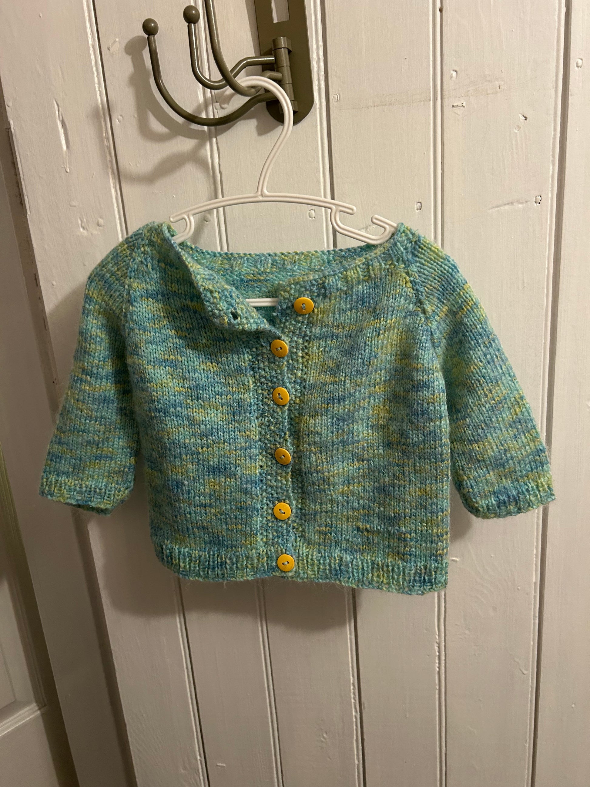 Handmade brand. Button up cardigan. Yellow & blue speckled with yellow buttons. Approx size 6m. Brand new conditionÂ