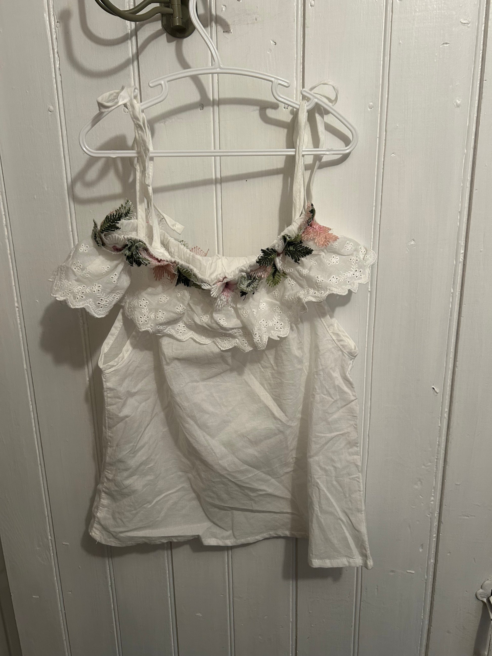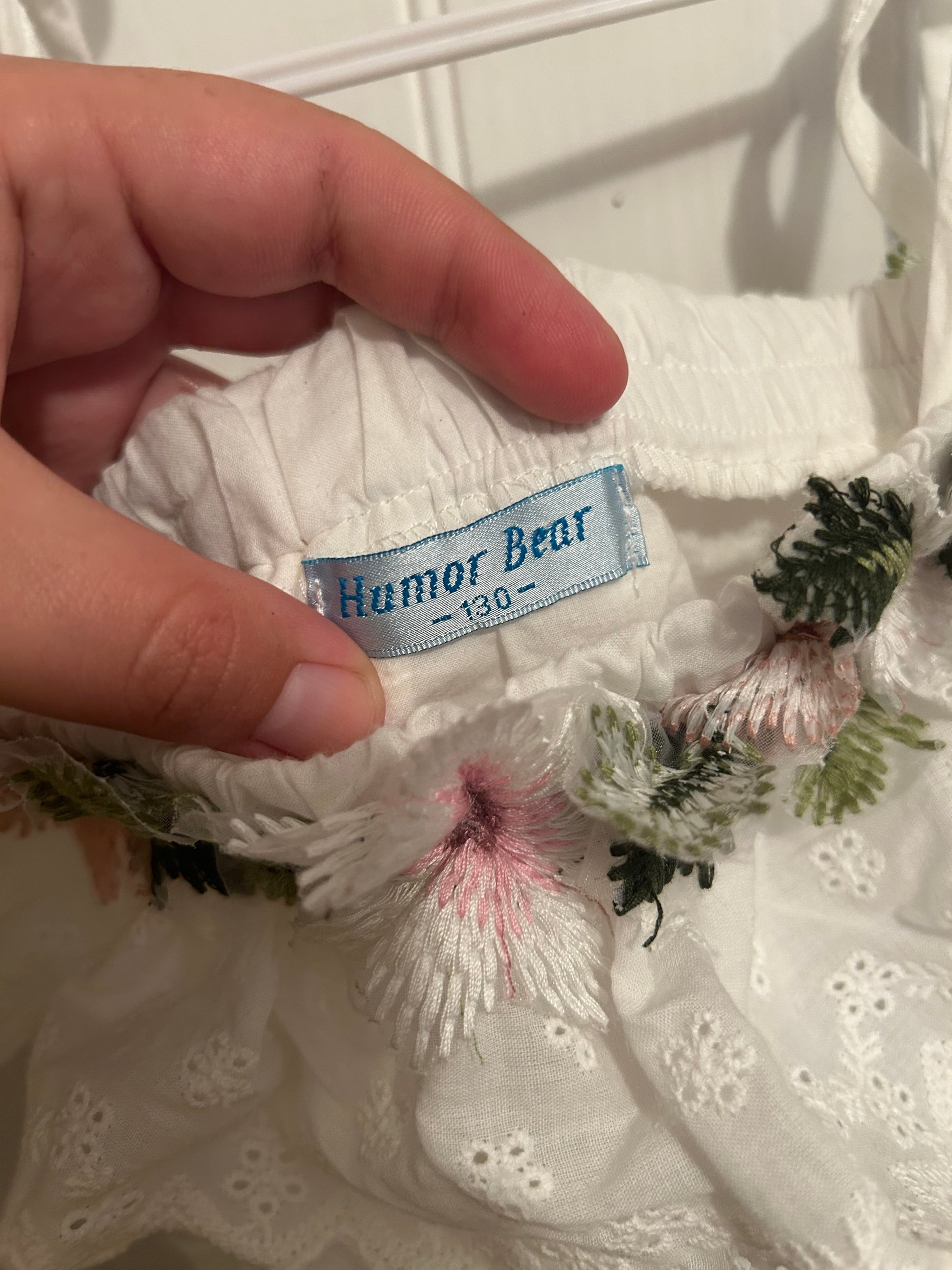 Humor bear brand. Adjustable tie spaghetti strap off the shoulder floral lace tank top. White with pink florals. Labeled 130 which is approximately girls 6-8, my daughter wore as a dress in 3t and a tank top as a size 6. Brand new conditionÂ