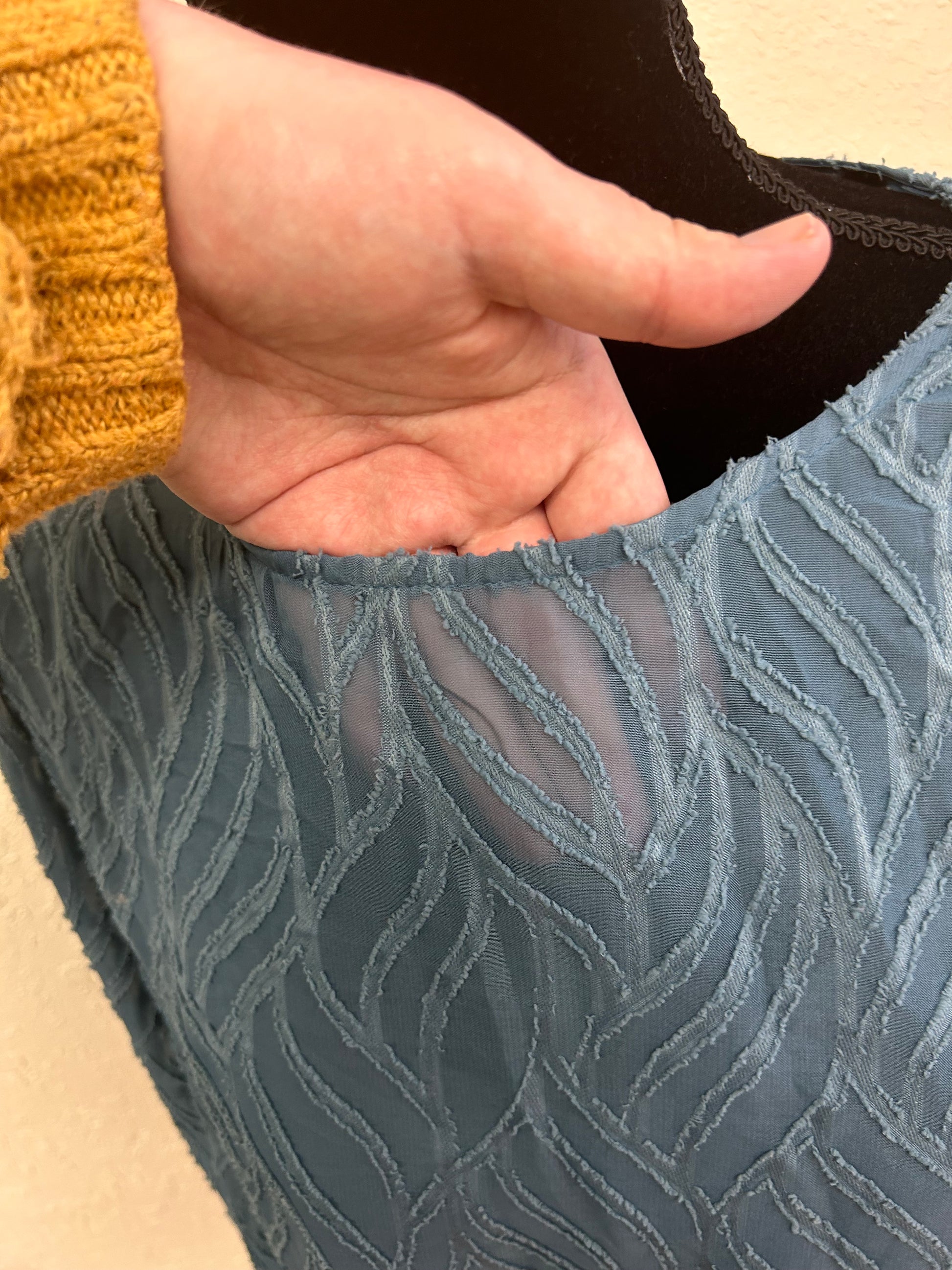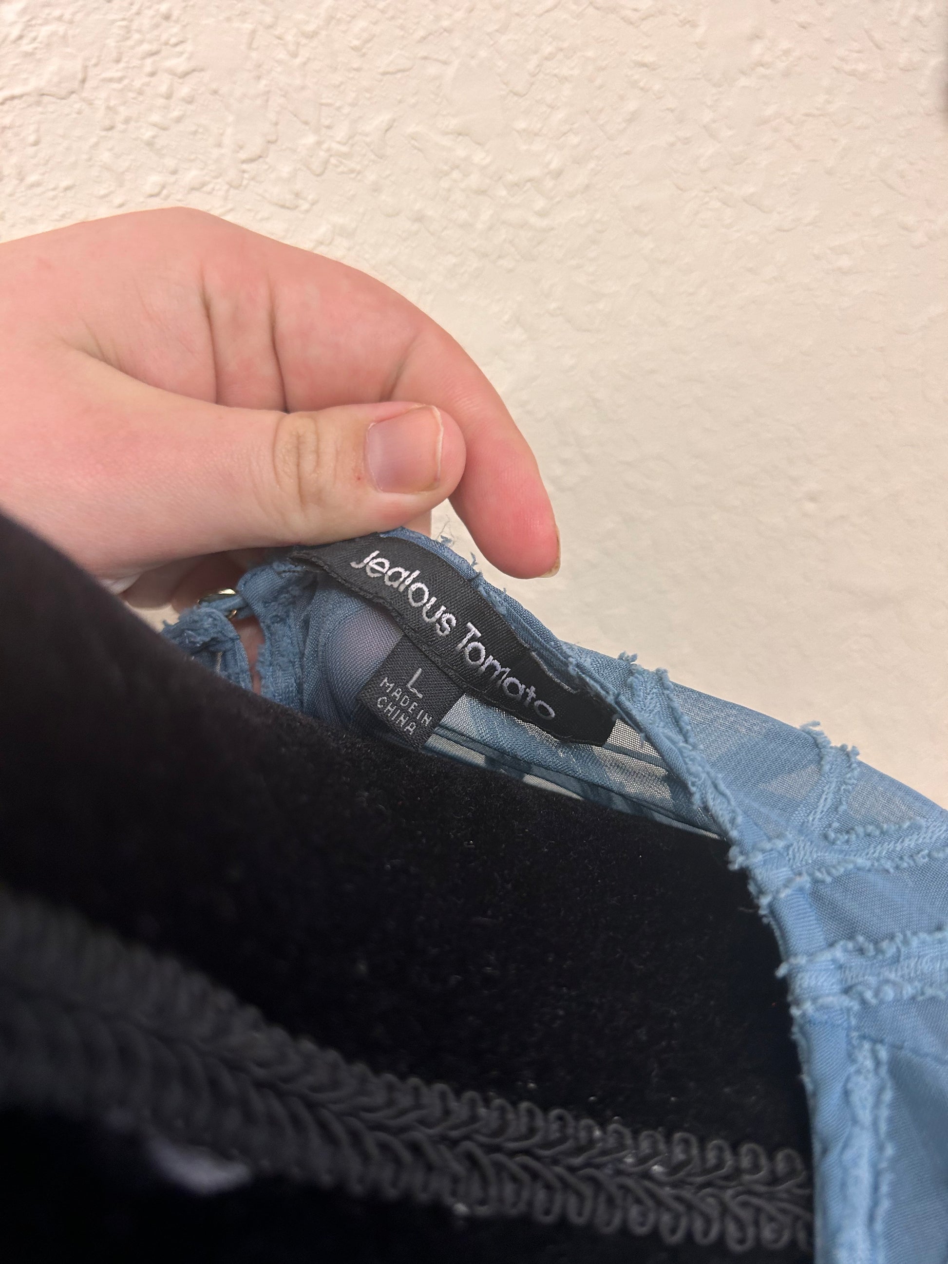Jealous tomatoe. Long sleeve sheer blouse with built in tank. Blue textured print. Size large. Brand new condition