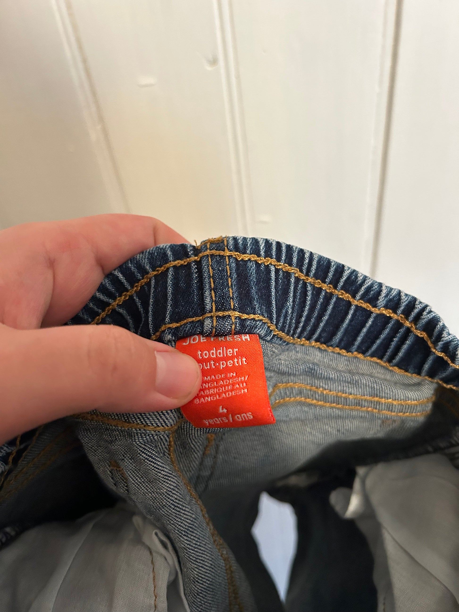 Joe fresh brand. Medium wash denim skirt with embroidered colourful shapes on the one inner pocket. Size 4t. Brand new condition