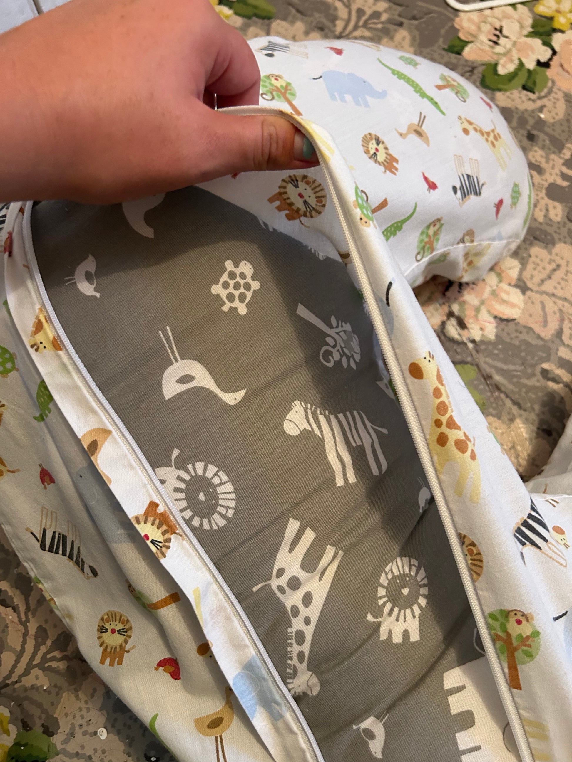 Jolly jumper brand. Nursing boppy pillow. Grey animal print pillow with colourful animal cover. Brand new conditionÂ