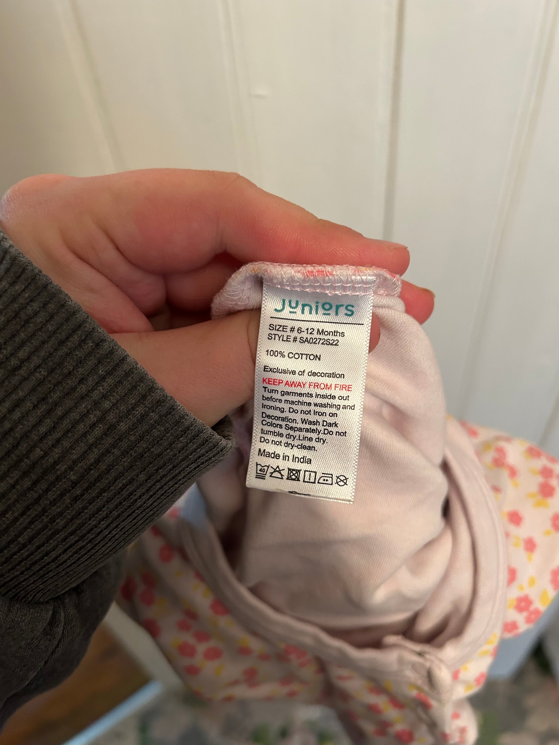 Juniors brand. Long sleeve sleeper with crotch snaps. Pink floral. Size 6/12m. Brand new condition
