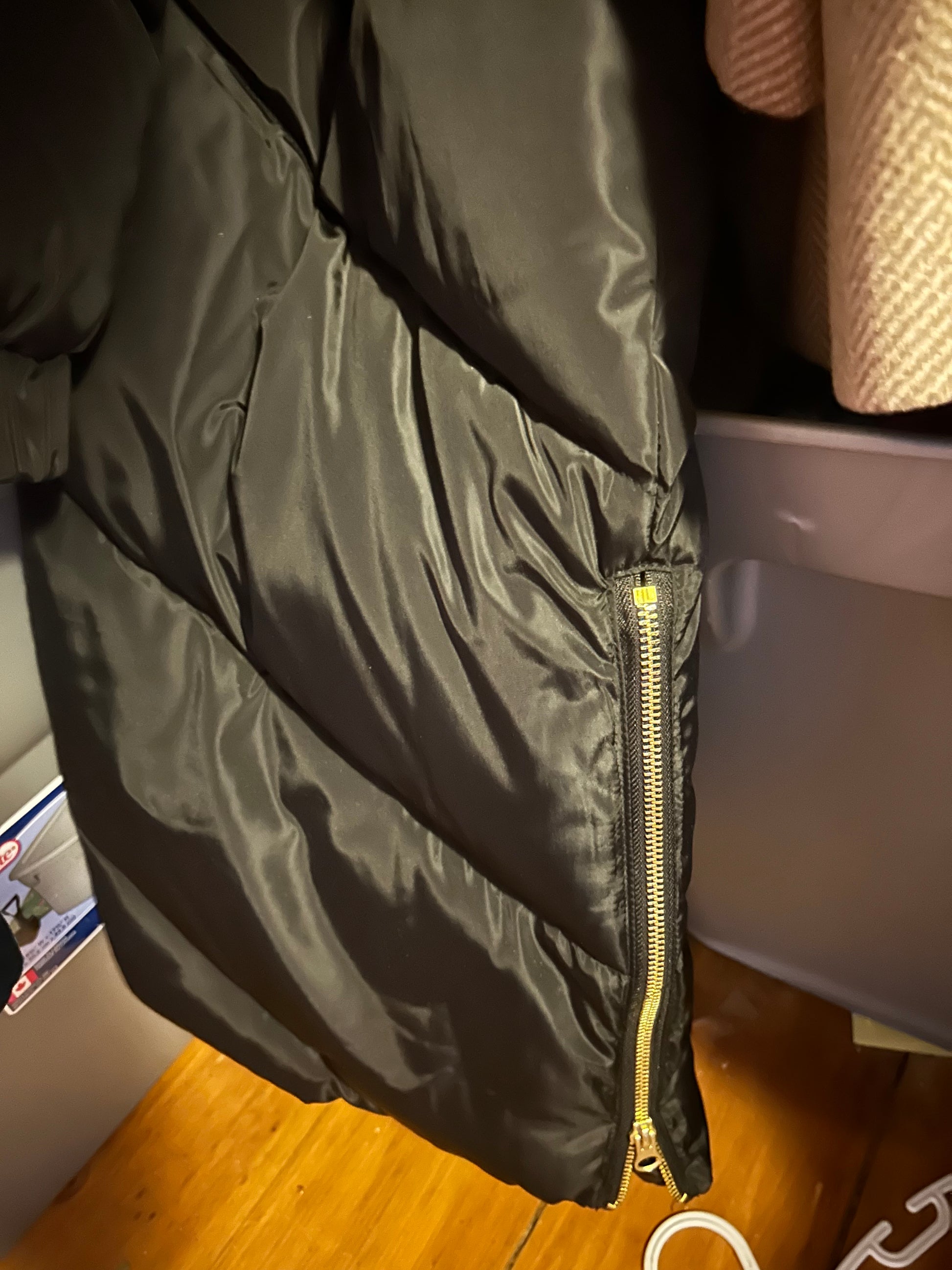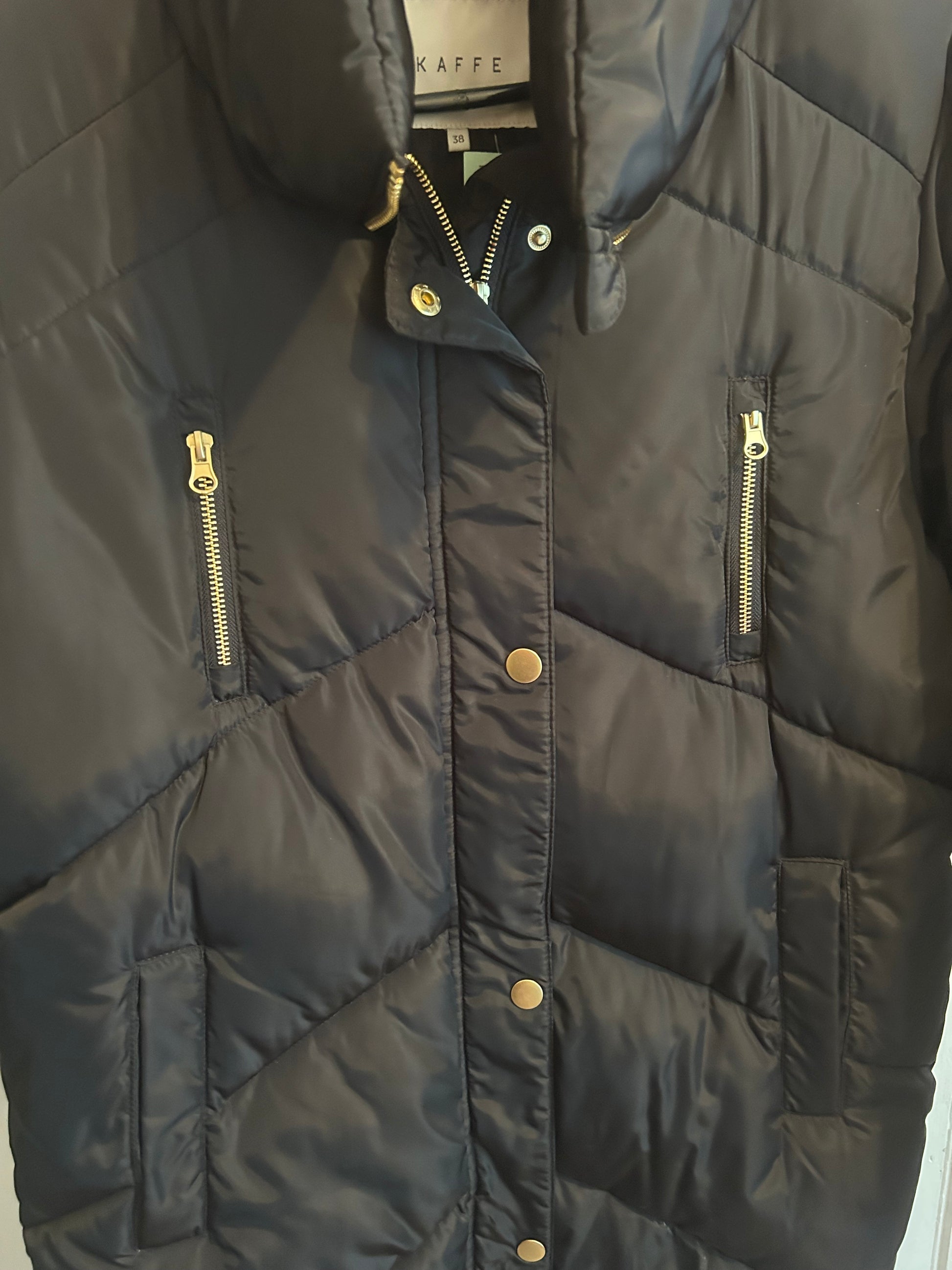 Kaffe brand. Approx knee length zip up winter puffer jacket. No hood. Zippier bottom sides for extra movement. Size 38, appropriately a medium. Brand new condition.