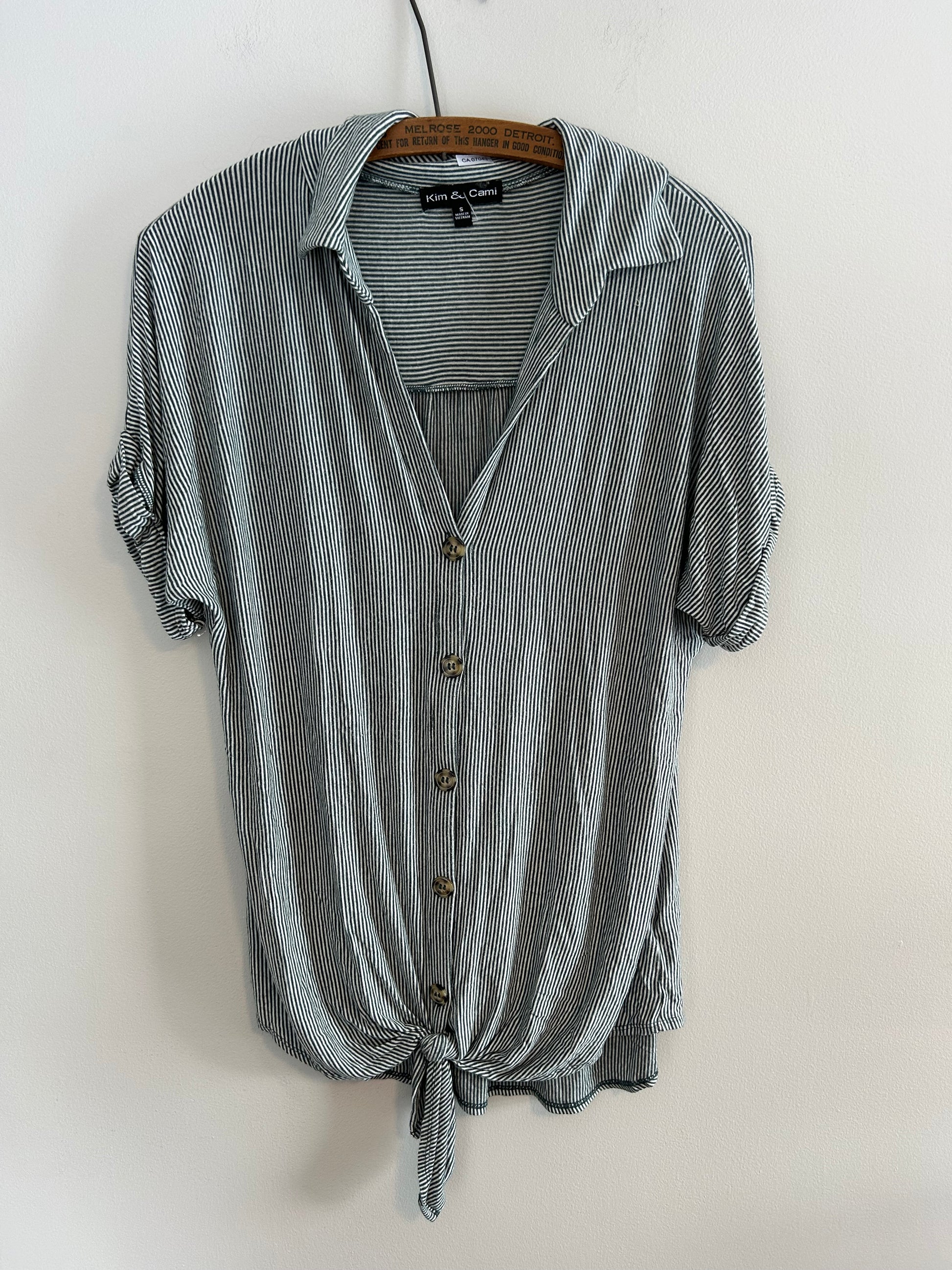 Kim & cami small green striped button up twist tie hem top
