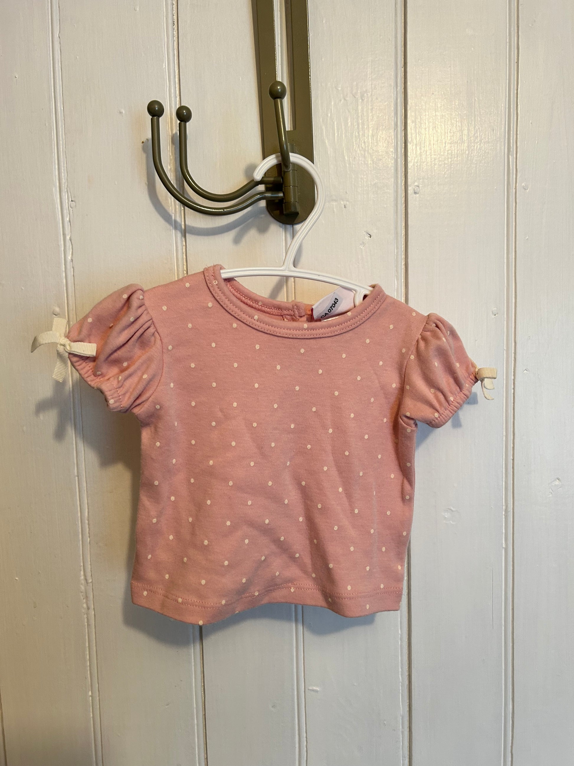 Little lass brand. Short puff sleeve tshirt. Pink with white polka dots. Size 3/6m. Brand new condition