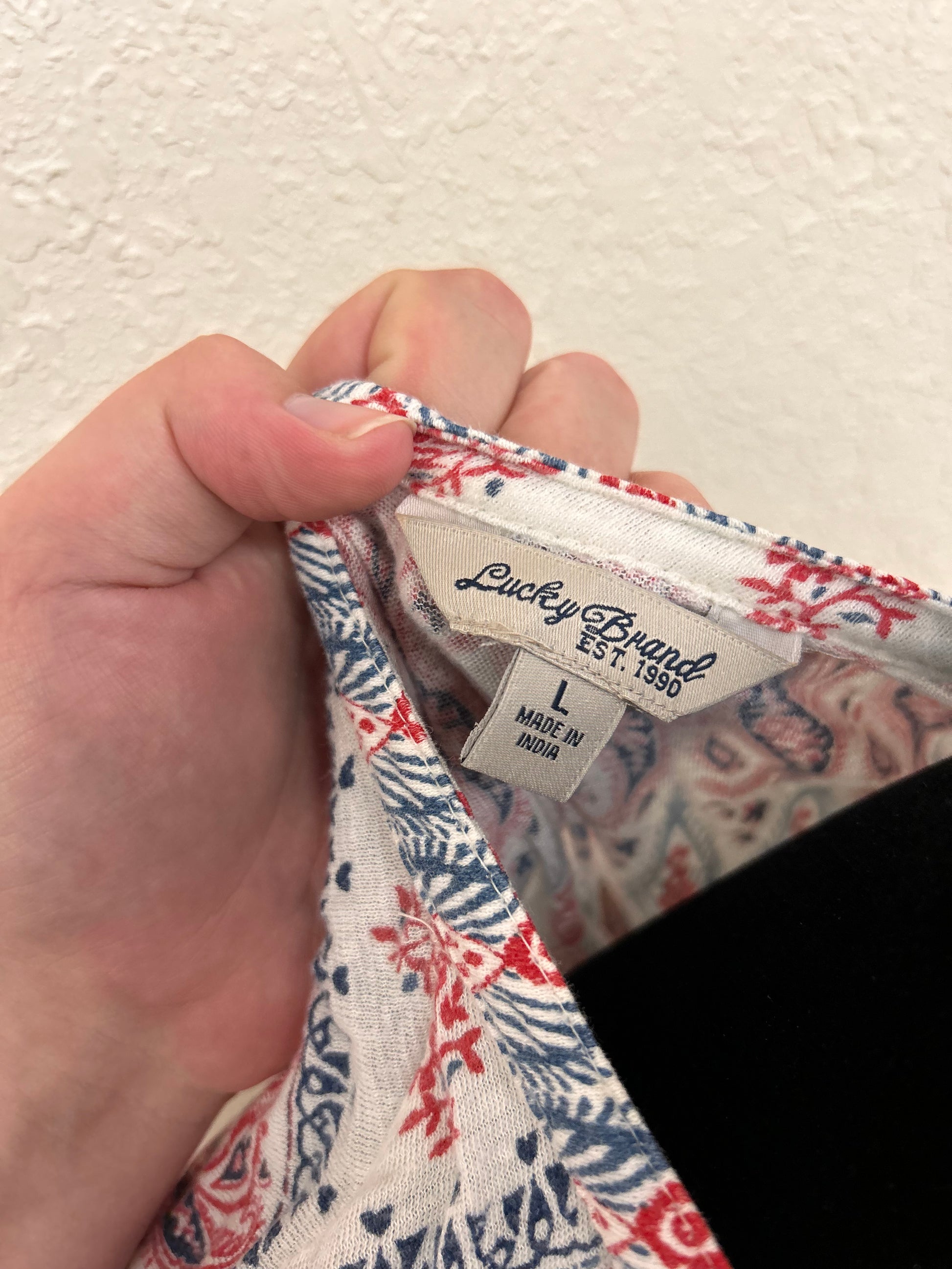 Lucky brand. Long sleeve button up blouse. White with black & red paisley like print. Size large. Brand new condition