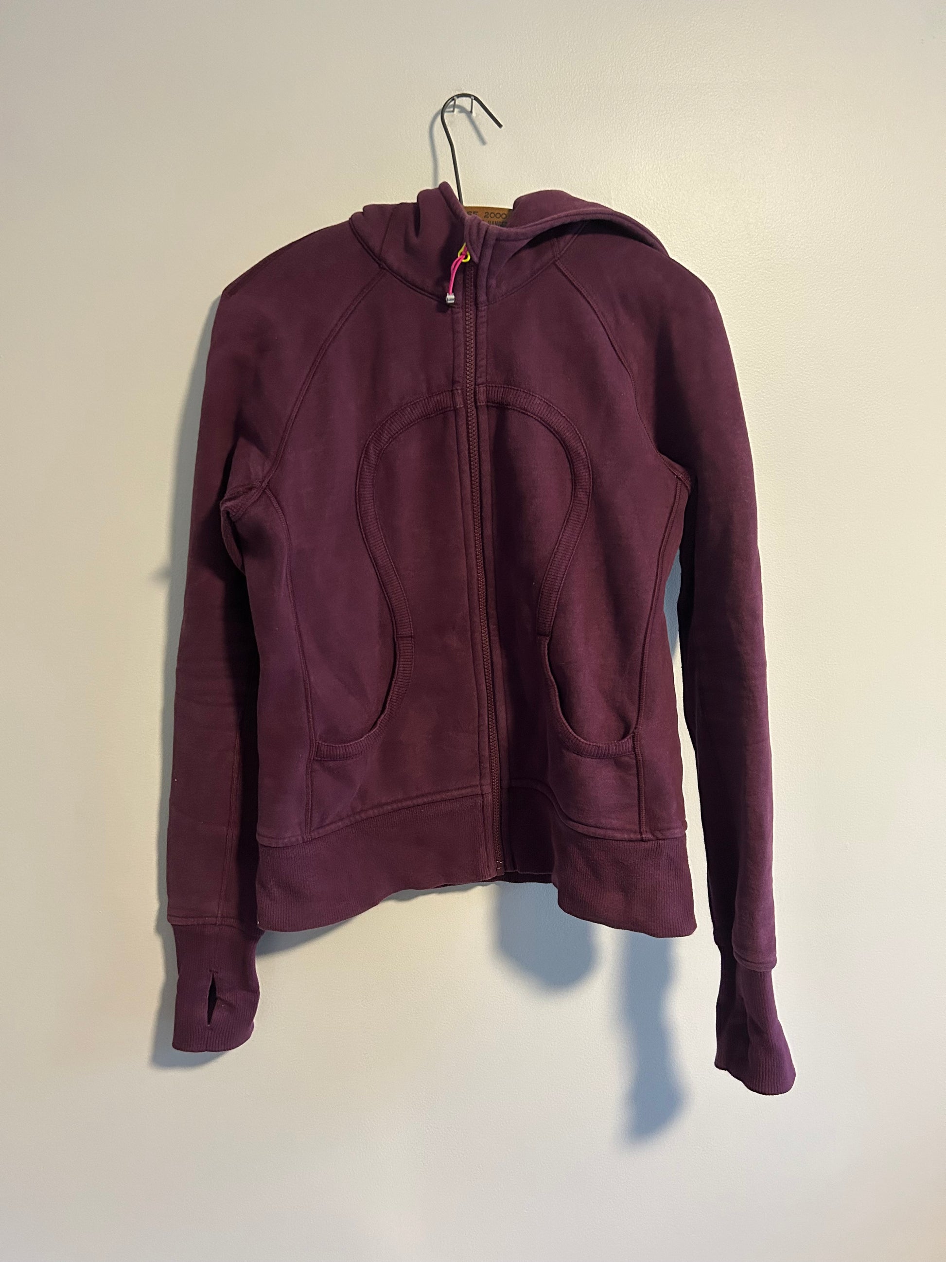Lululemon brand. Zip up hooded scuba sweater. Purple in colour. Size women’s 8. Brand new condition