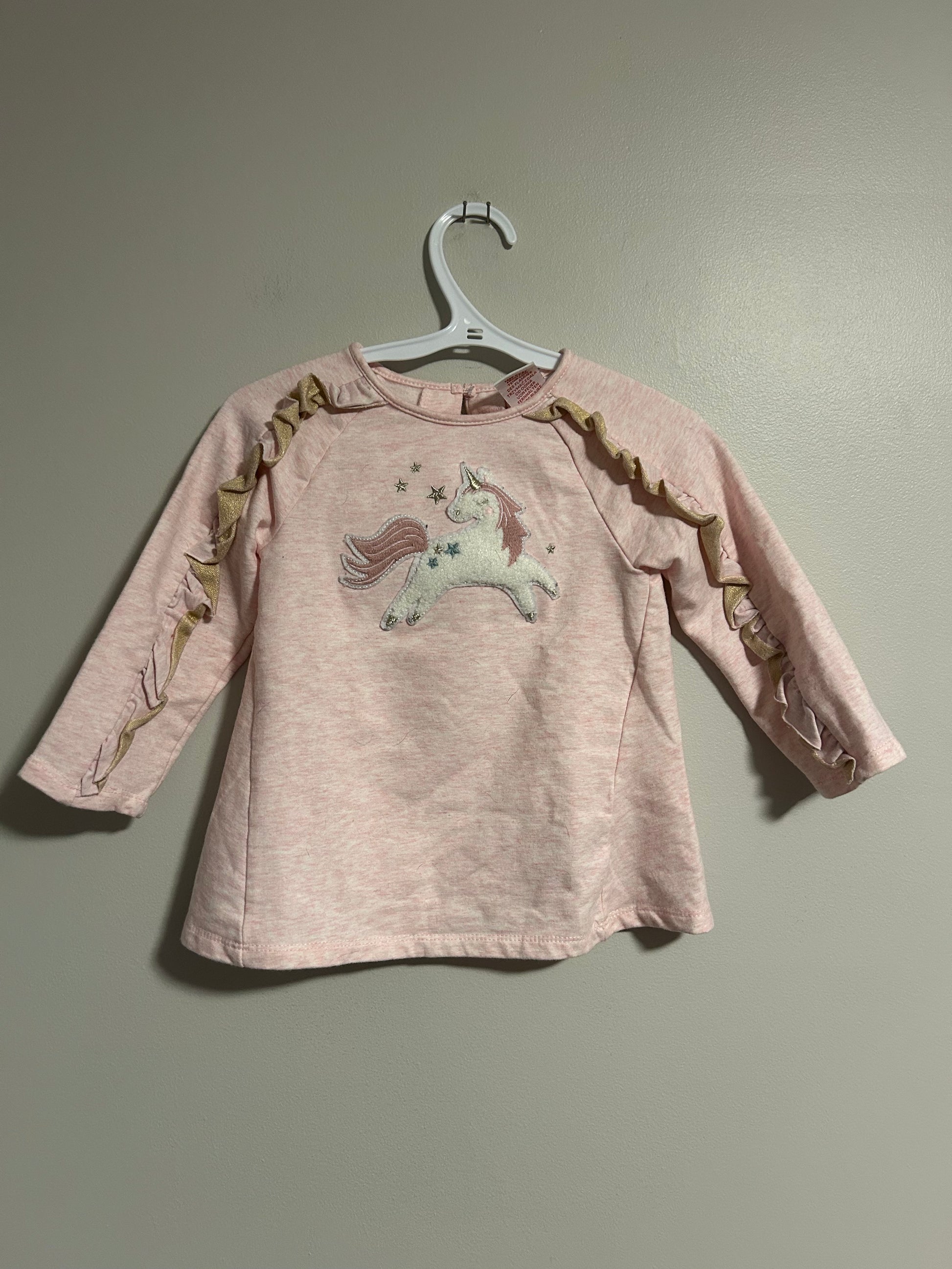 Lulurain brand. Long sleeve ruffle sleeve sweater. Pink unicorn. Size 24m. Brand new condition