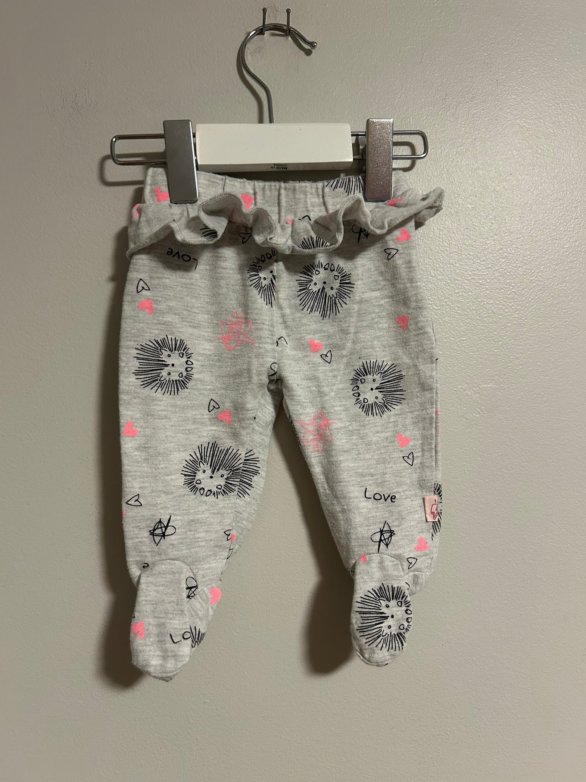 Mini hero brand. Footed pants. Grey with pink & black hedgehog print. Size newborn. Brand new conditionÂ