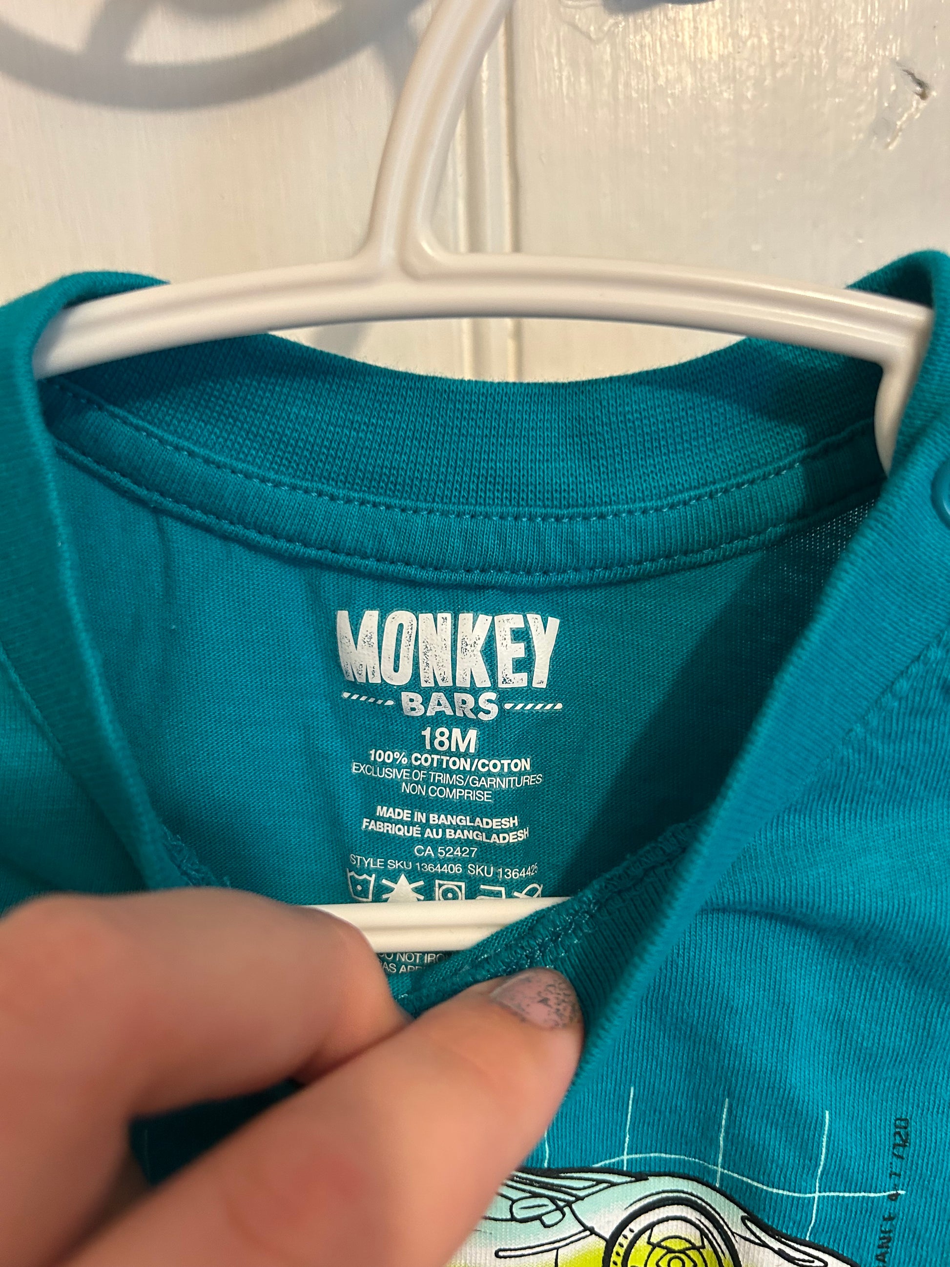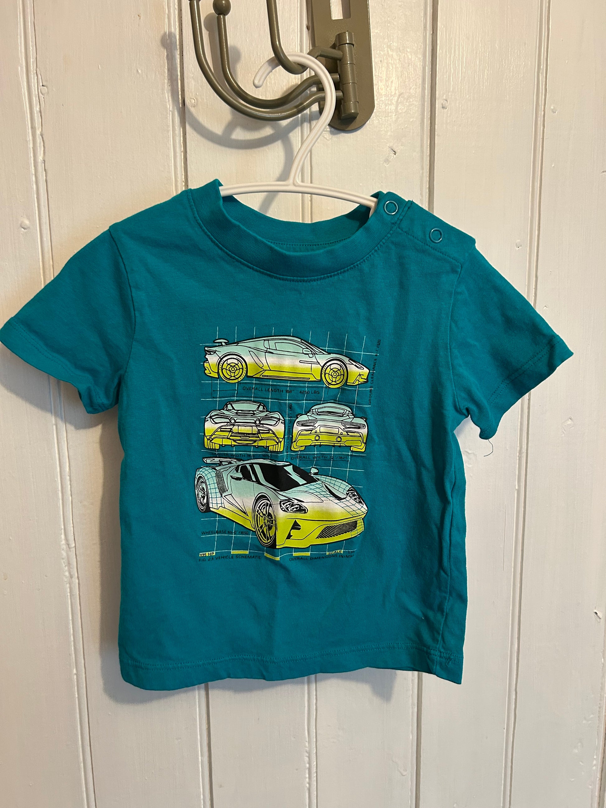 Monkey bars brand. Short sleeve graphic Tshirt. Blue with black, white & green car print. Size 18m. Brand new condition