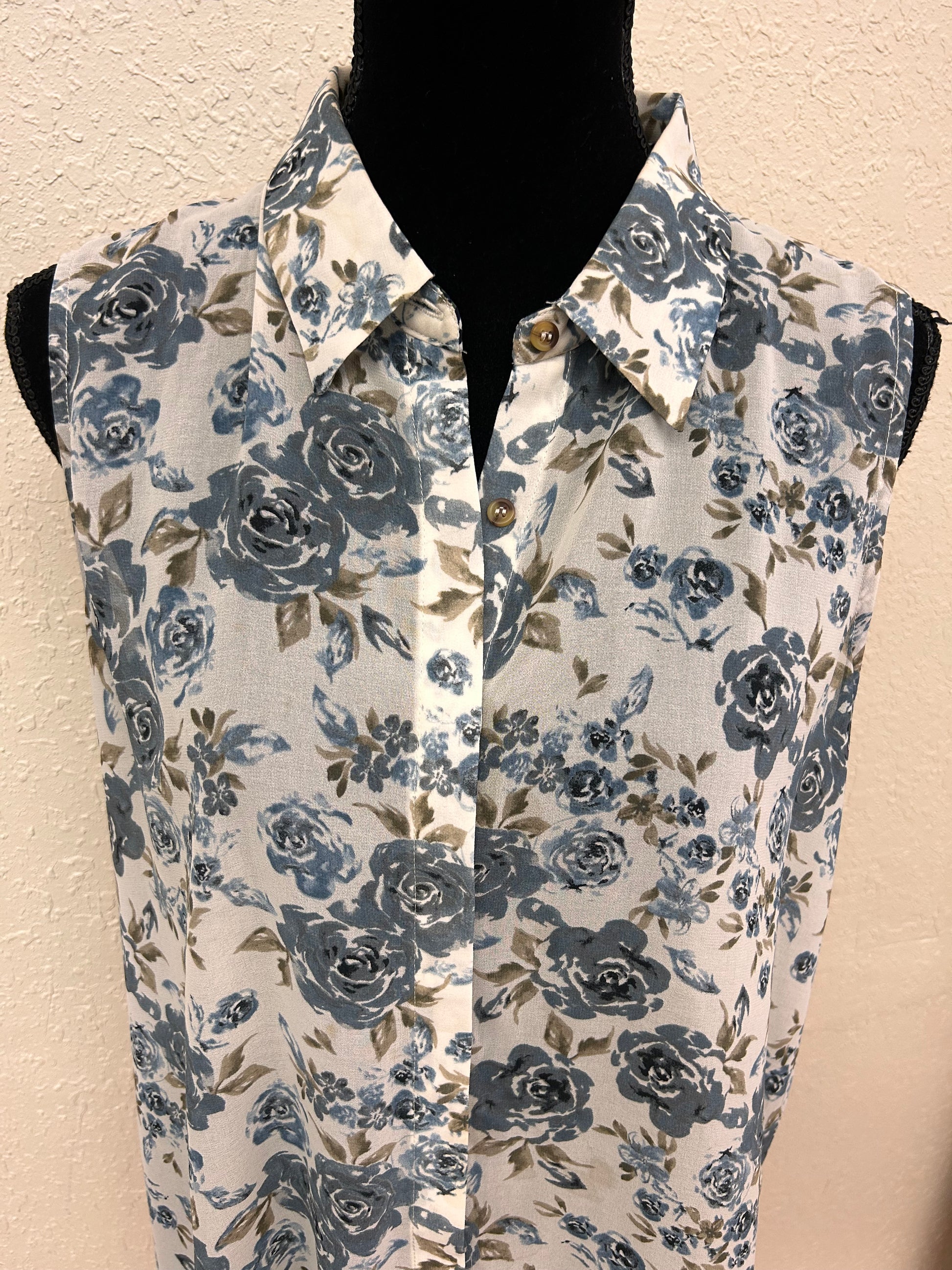 Mystree brand. Sleeveless button up blouse. Blue floral. Size large. Brand new condition minus two small brown marks on back shoulders which may wash out