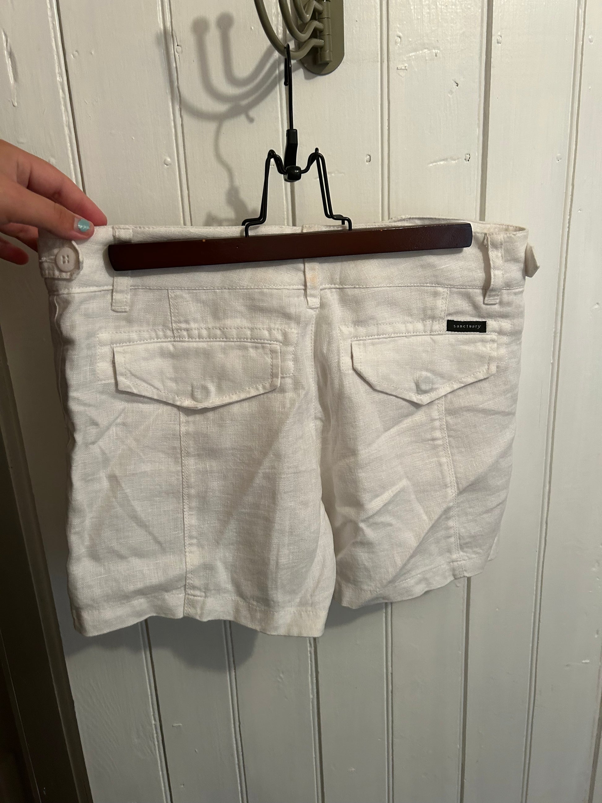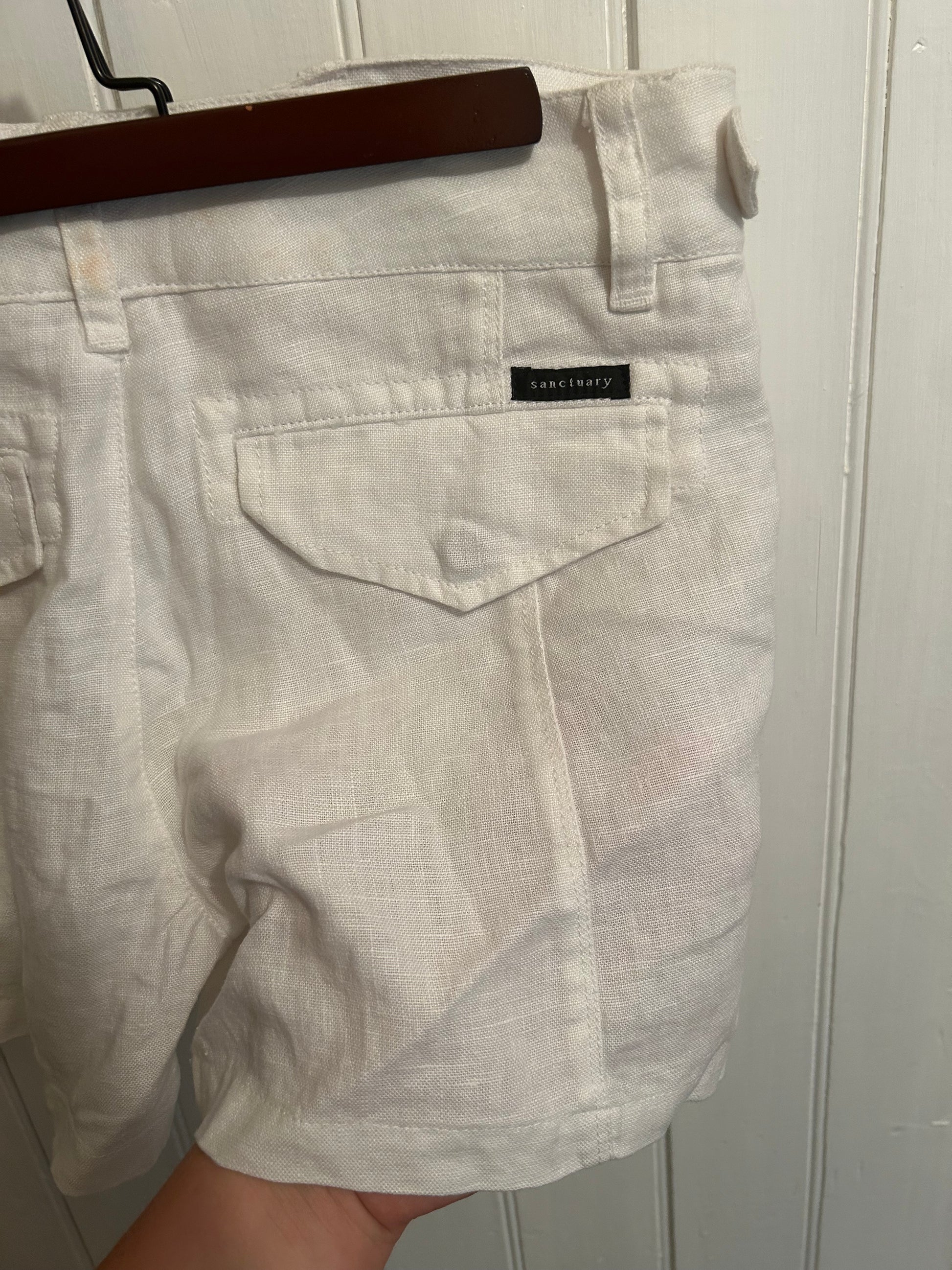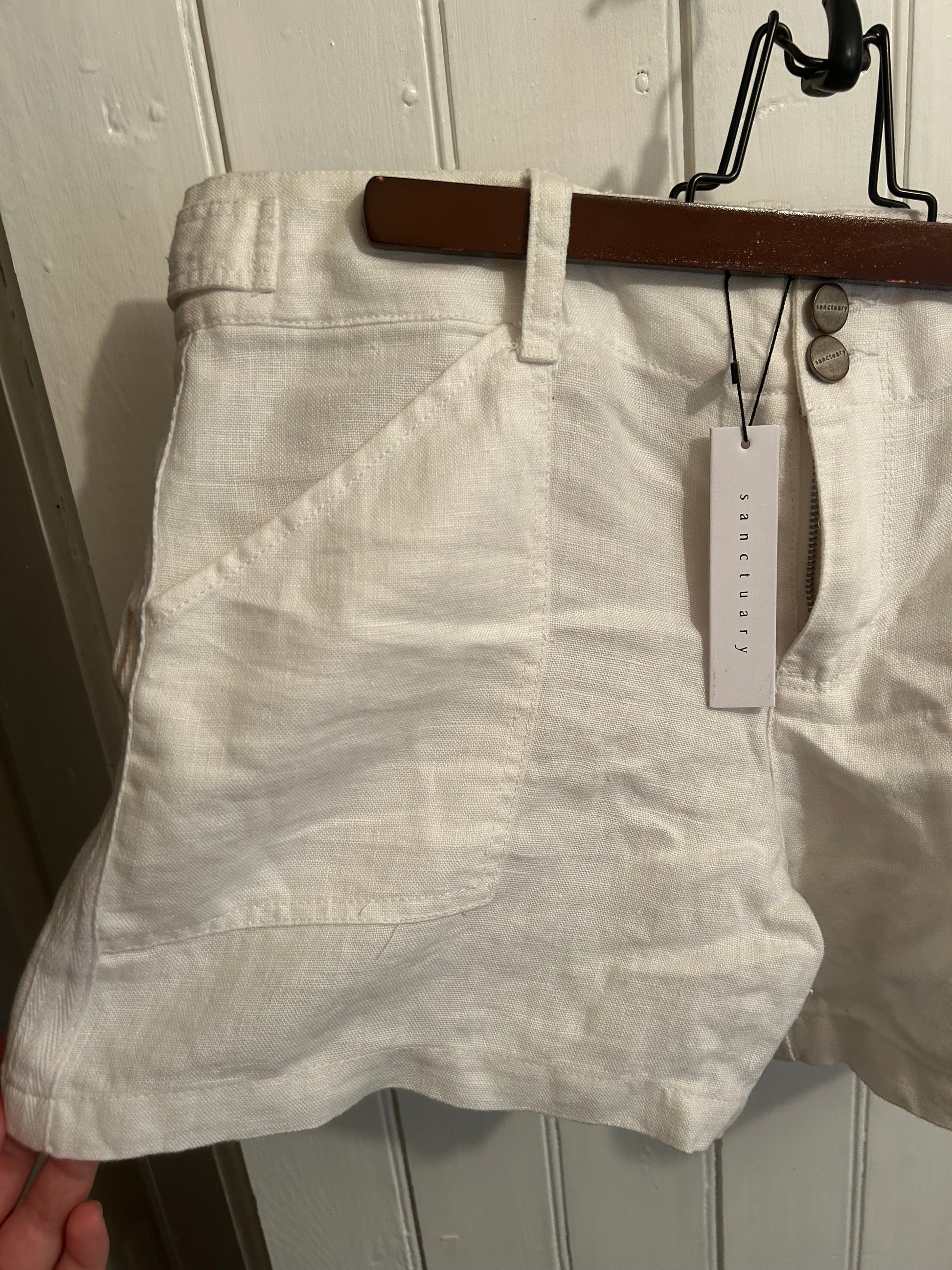 Sanctuary brand (for revolve). Off white linen shorts. Thinner material. Size women’s 29. Brand new with tags but light tan staining on back belt area, photographed.