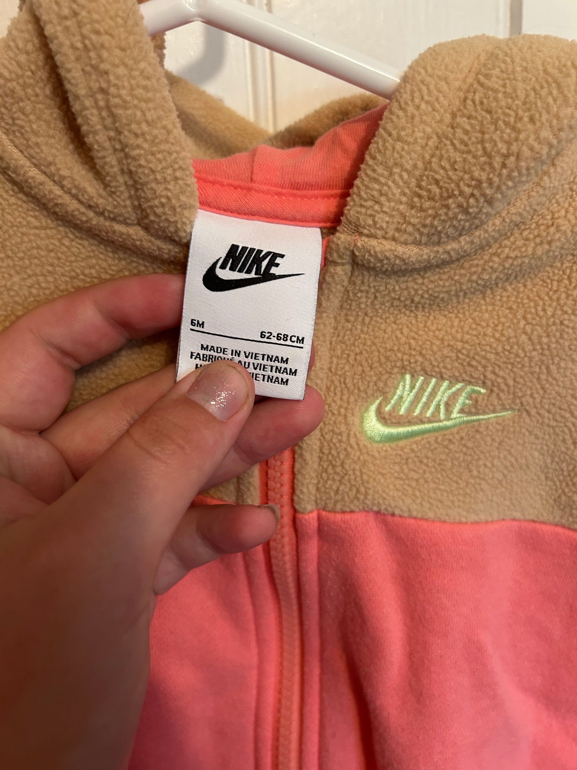 Nike brand. Zip up sweater romper. Pink & brown in colour. Size 6m. Brand new conditionÂ