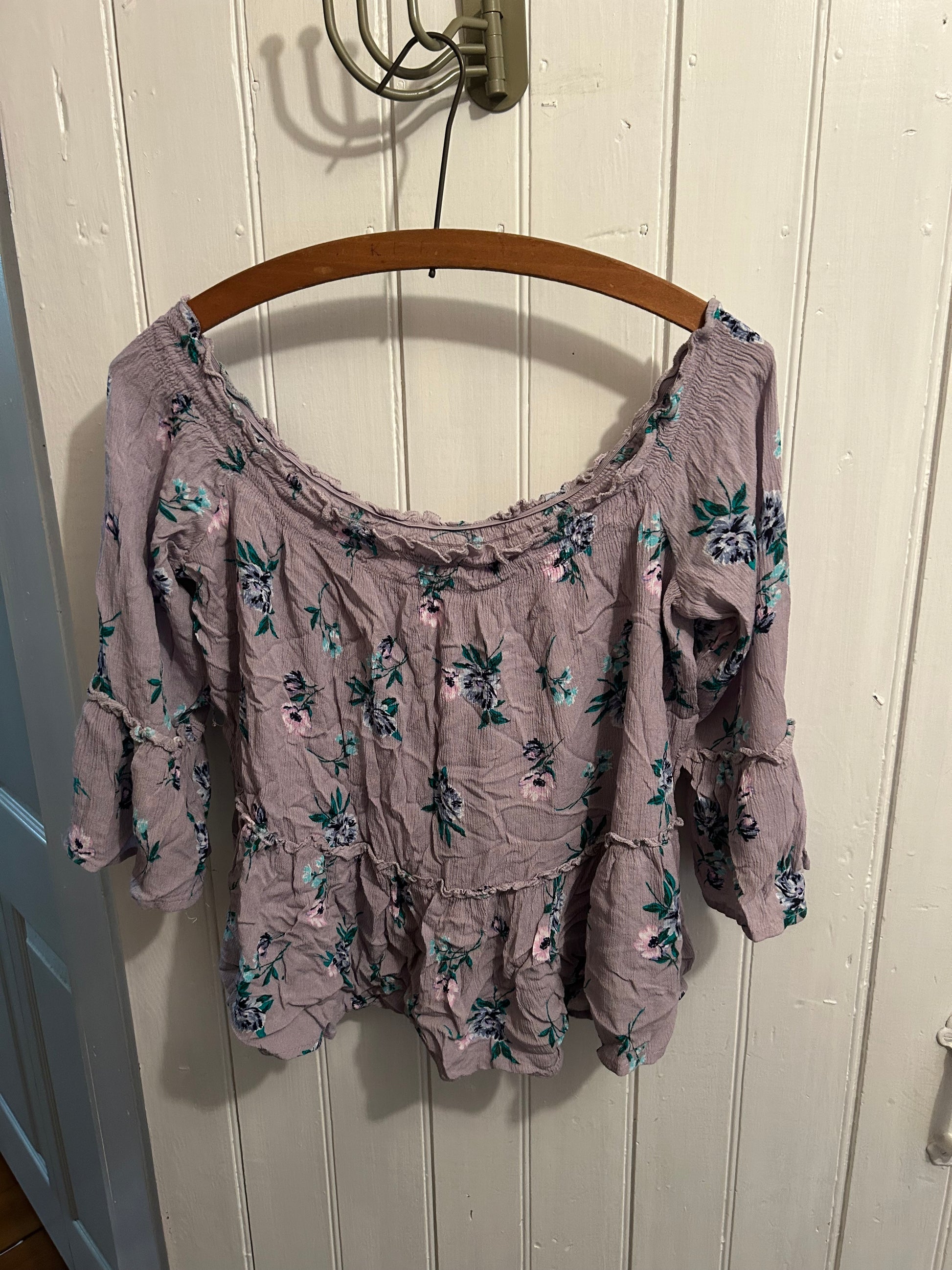 No comment brand. Off the shoulder flare sleeve blouse. Purple floral. Size large. Brand new condition