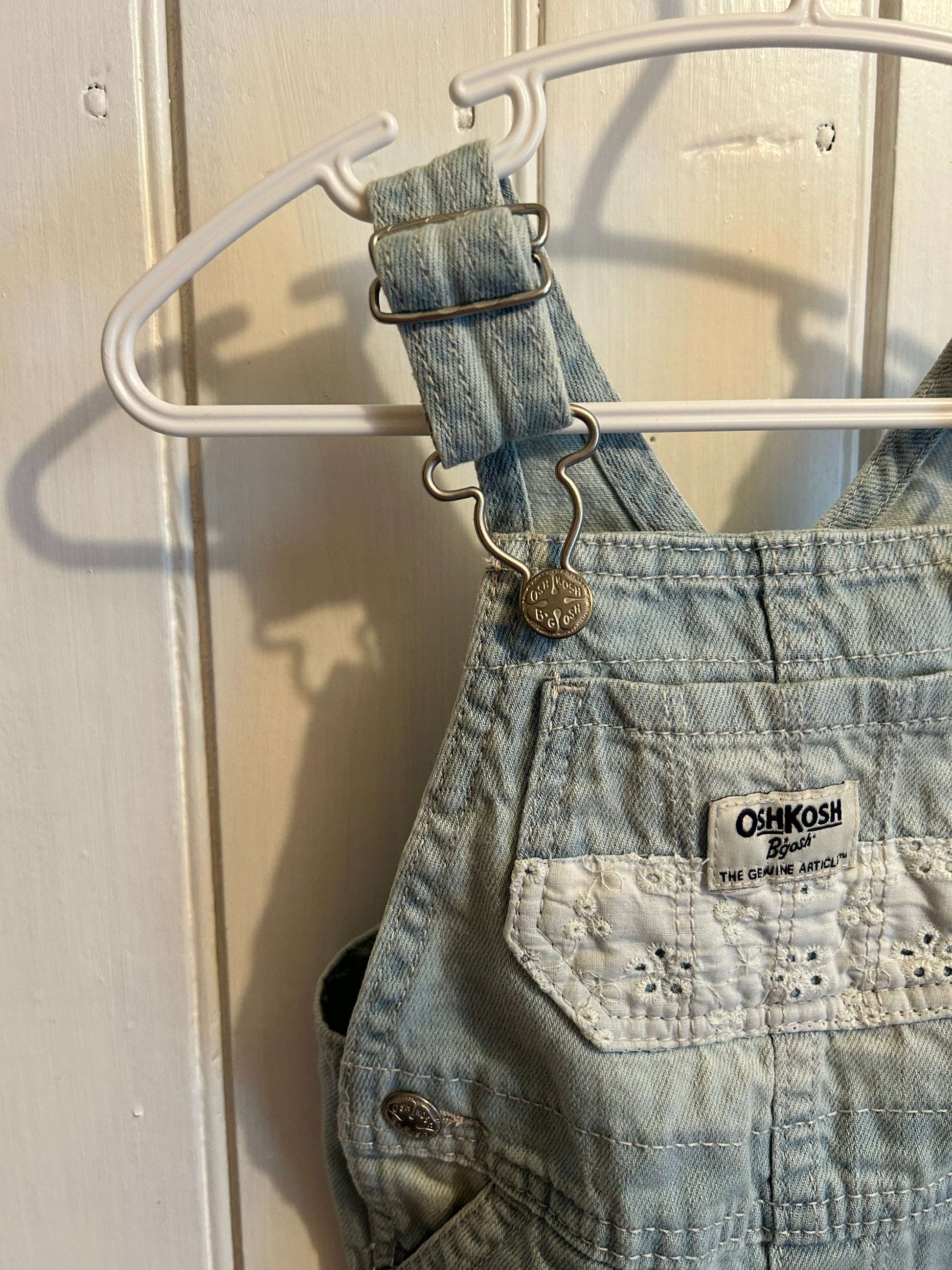 Oshkosh brand. Denim shorts overalls. Light wash denim with white lace accents. Size 6m. Brand new conditionÂ