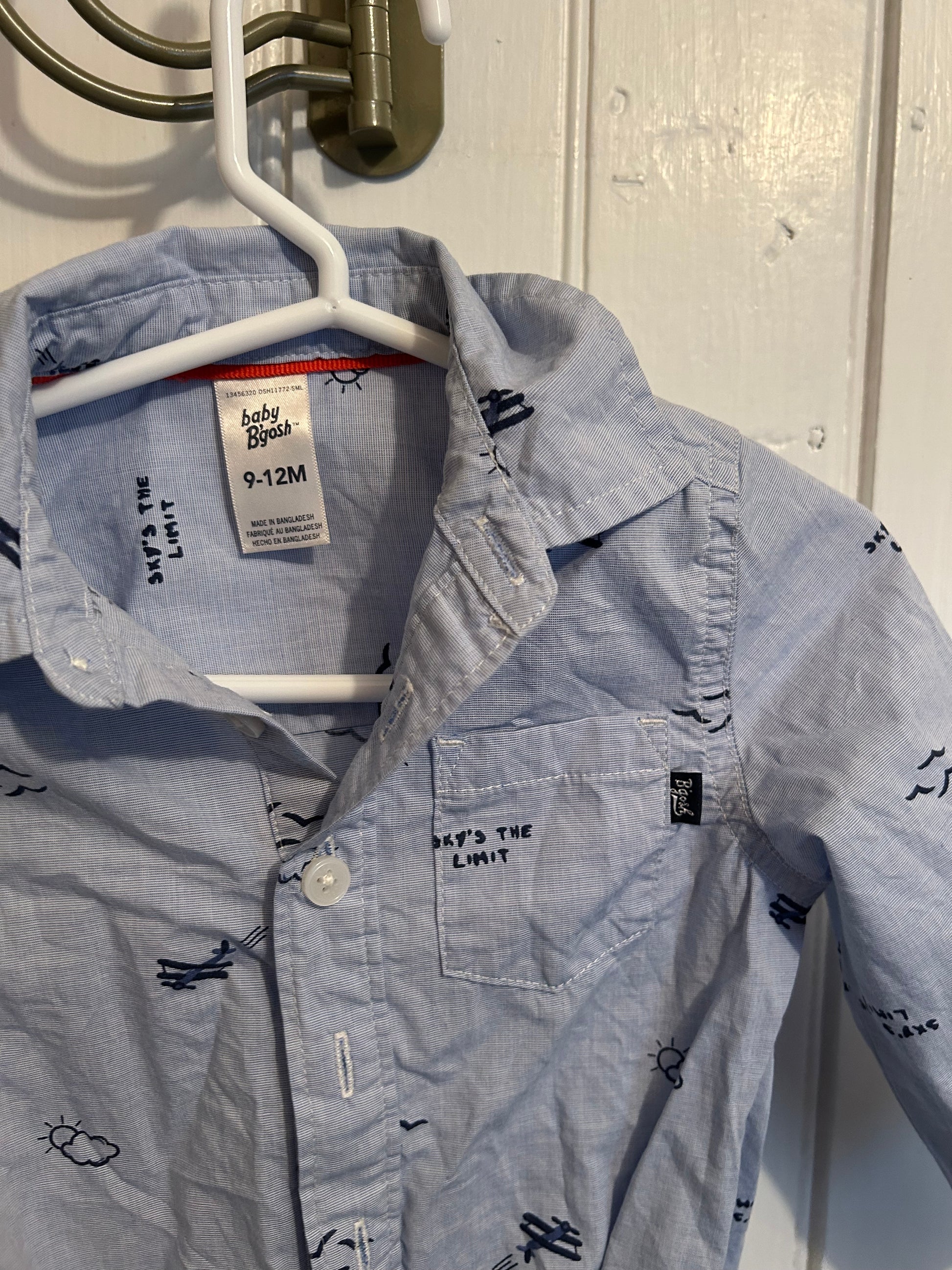 Oshkosh brand. Long sleeve button up collard shirt. Blue air plane like print. Size 9/12m. Brand new condition