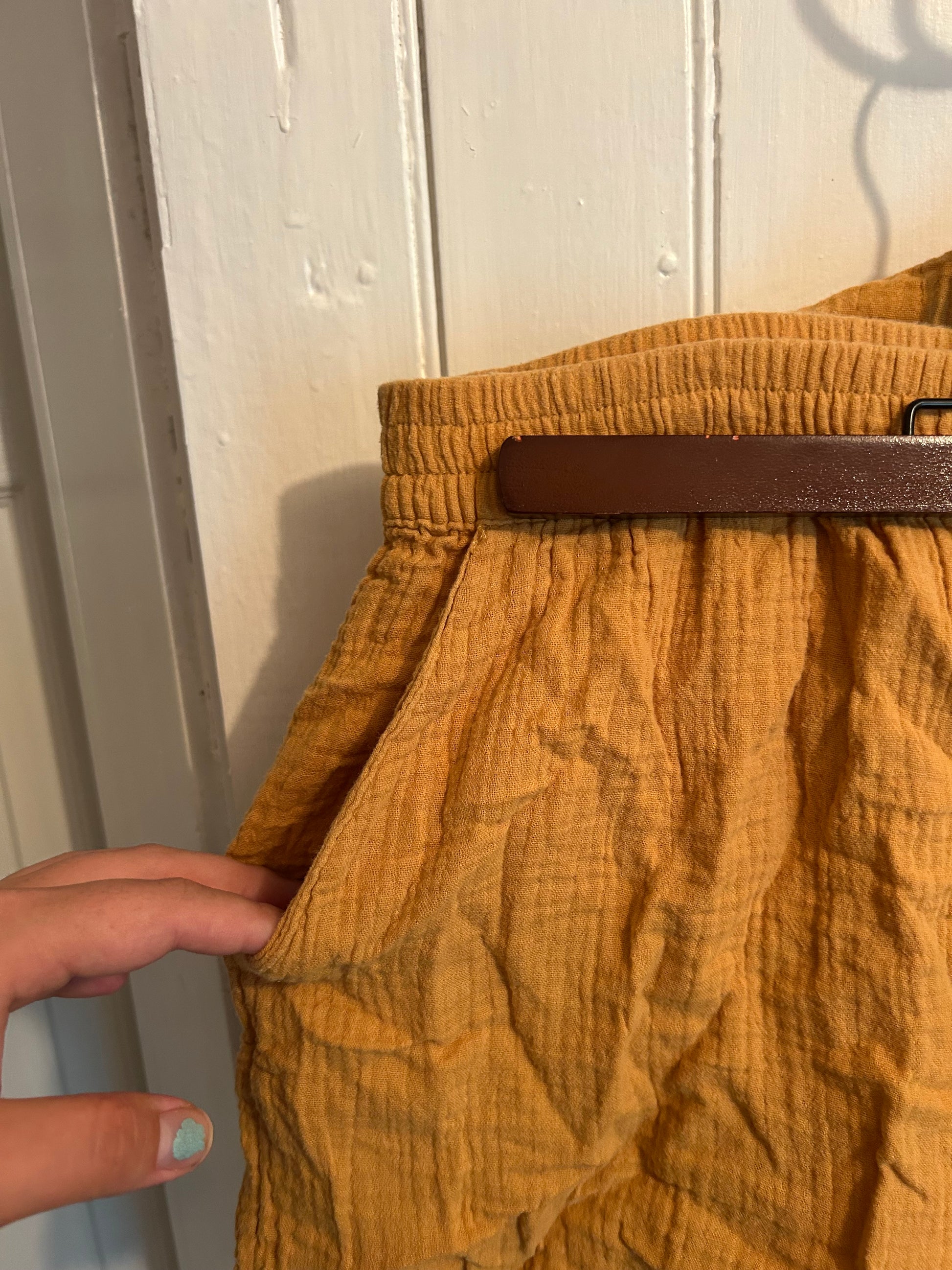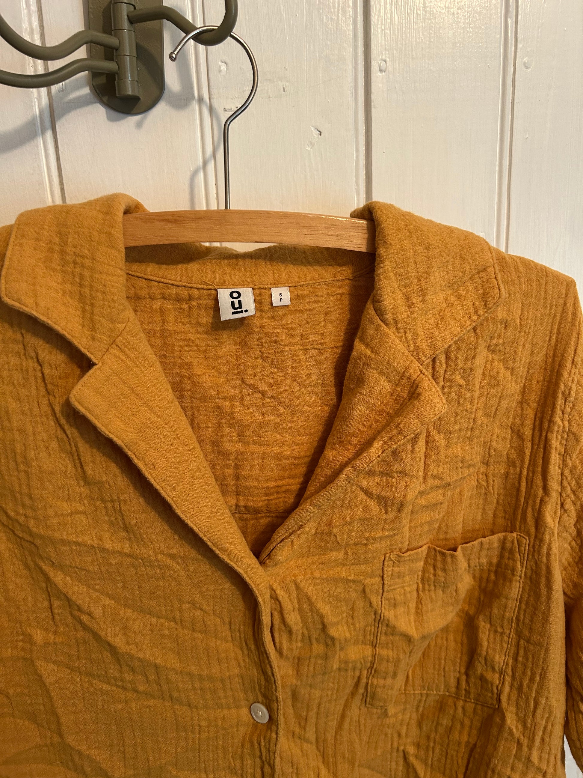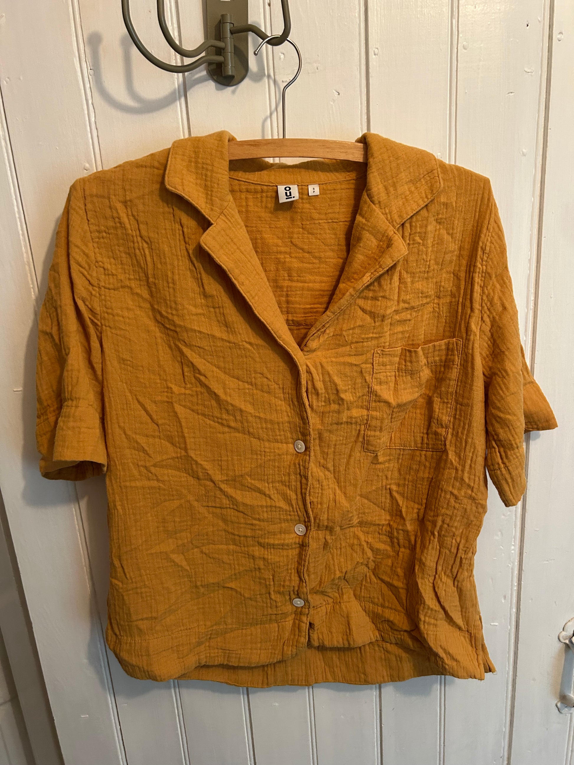 Oui brand. 2pc matching set of button up collard shirt and shorts. Yellow muslin material. Size small. Brand new condition