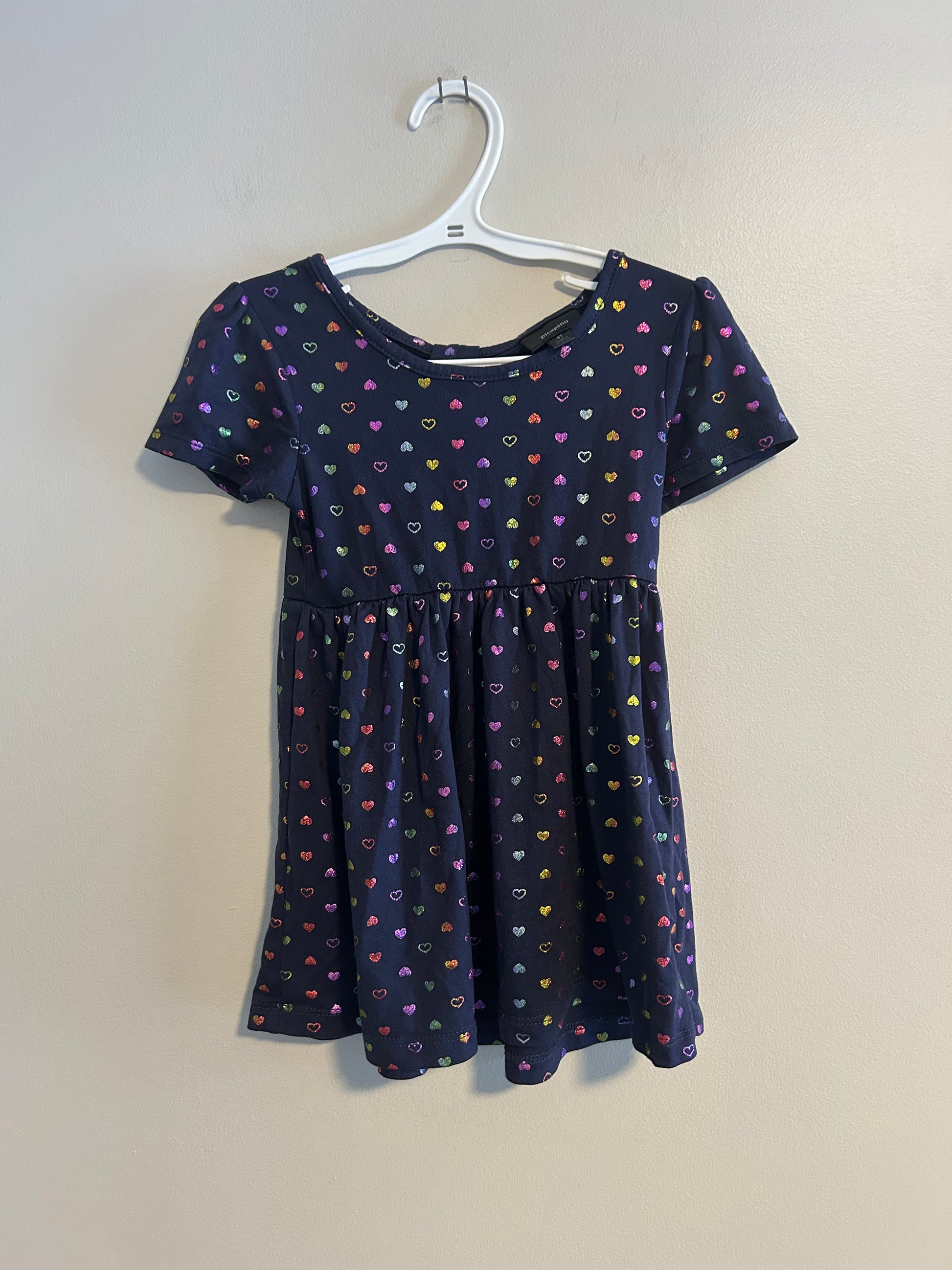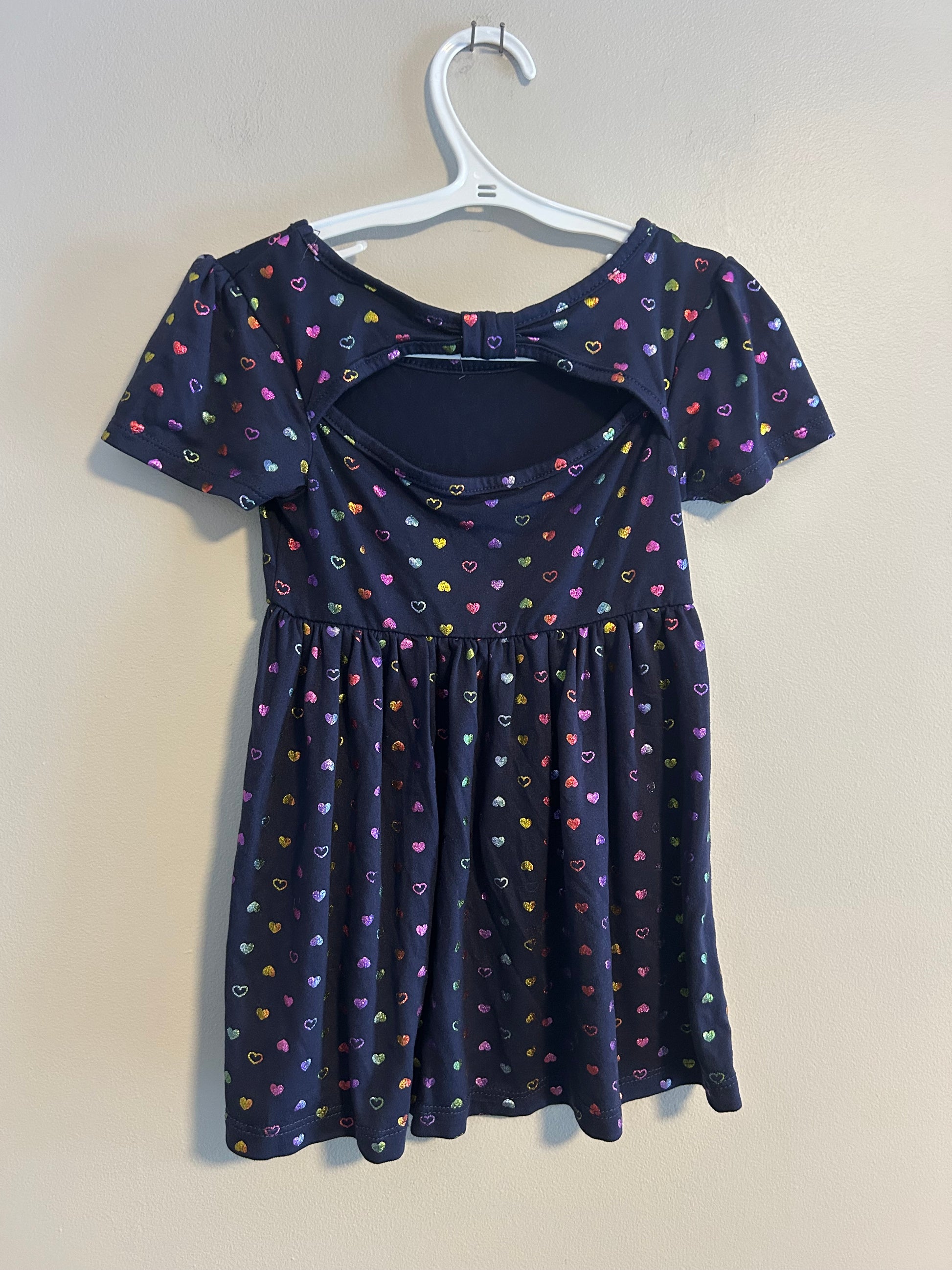 Picapino brand. Short sleeve open back dress. Navy blue with multicoloured metallic hearts. Size 4t. Brand new condition