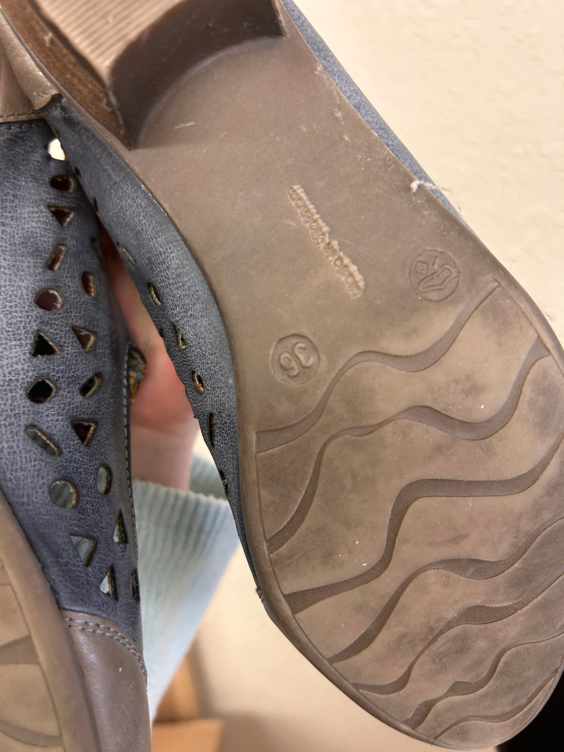 Remonte brand. Velcro heeled sandals. Closed peep toe. Cutout leather. Brown & blue in colour. Size EU 36 approx 6 US. Brand new condition