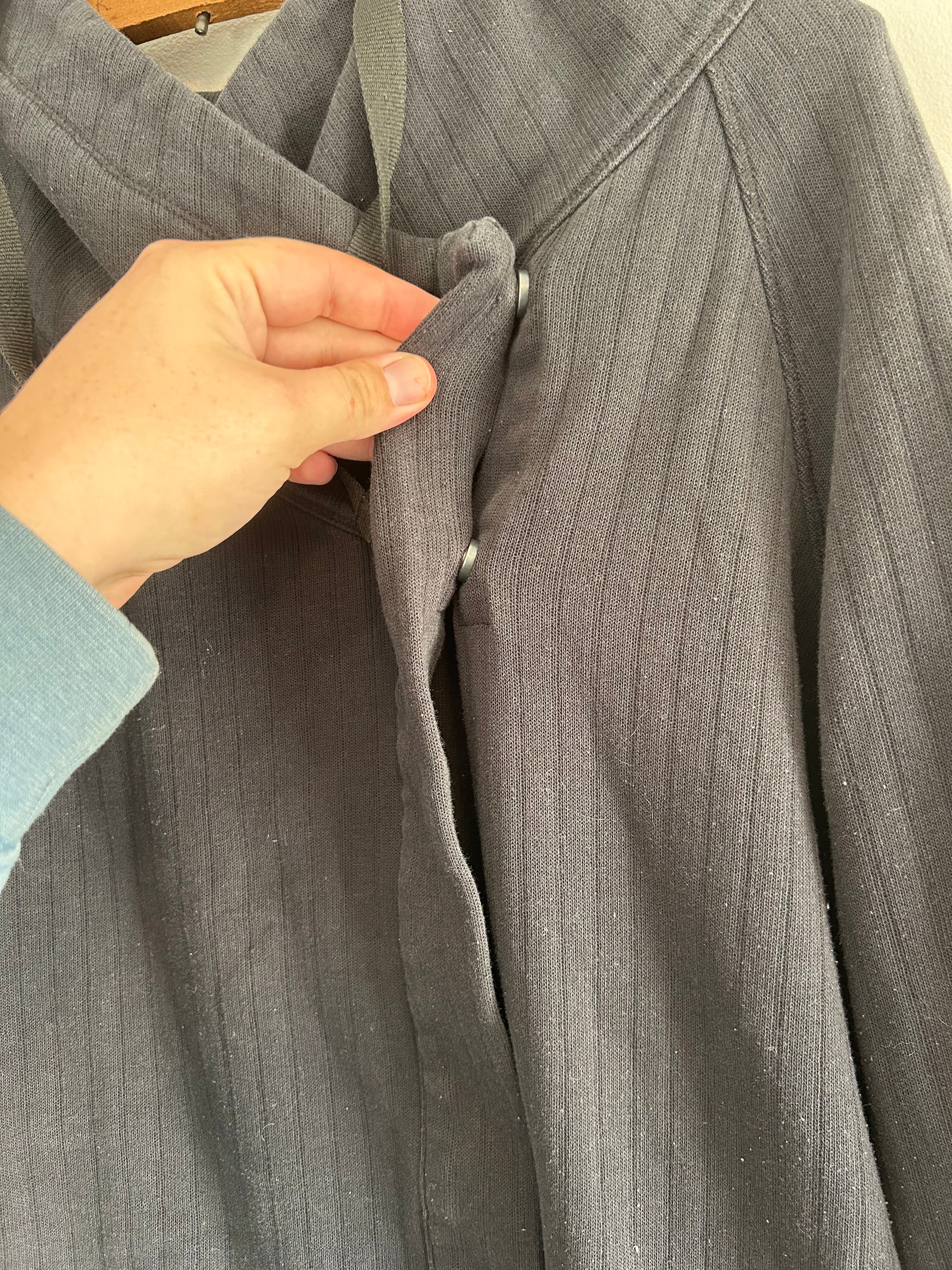 Shambhala brand. Long sleeve cowl neck cardigan with side wrap style button closure. Black In colour. Size small. Like new condition, light pilling.