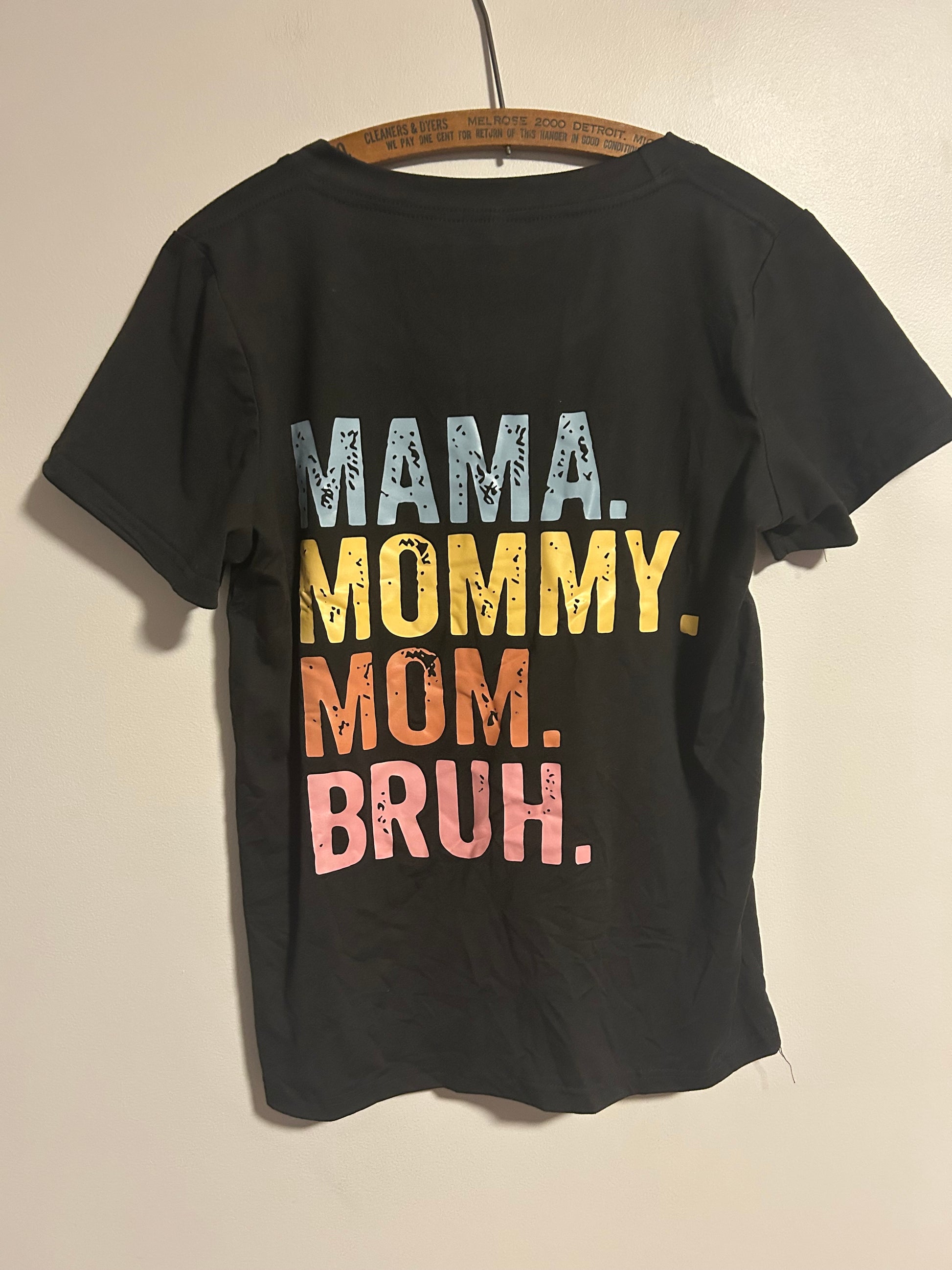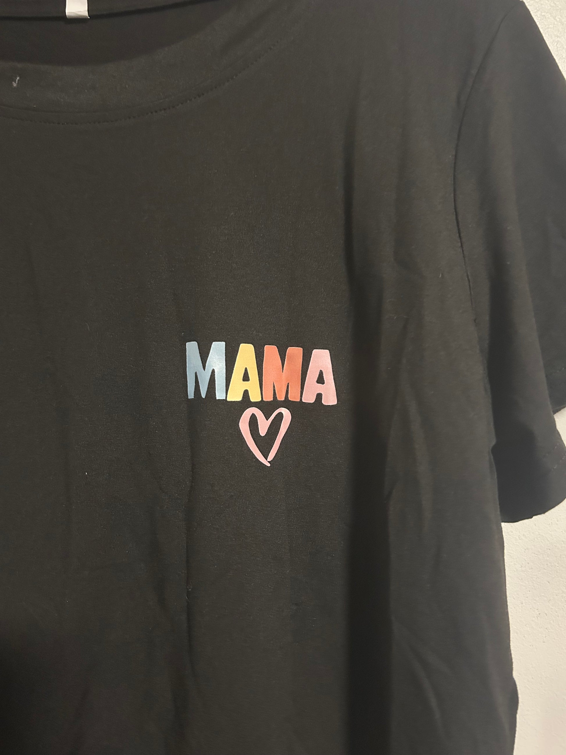 No brand. Short sleeve graphic T-shirt. Black with mama heart graphic on the front and multicoloured mama bruh graphic on the colour. Size small. Brand new condition