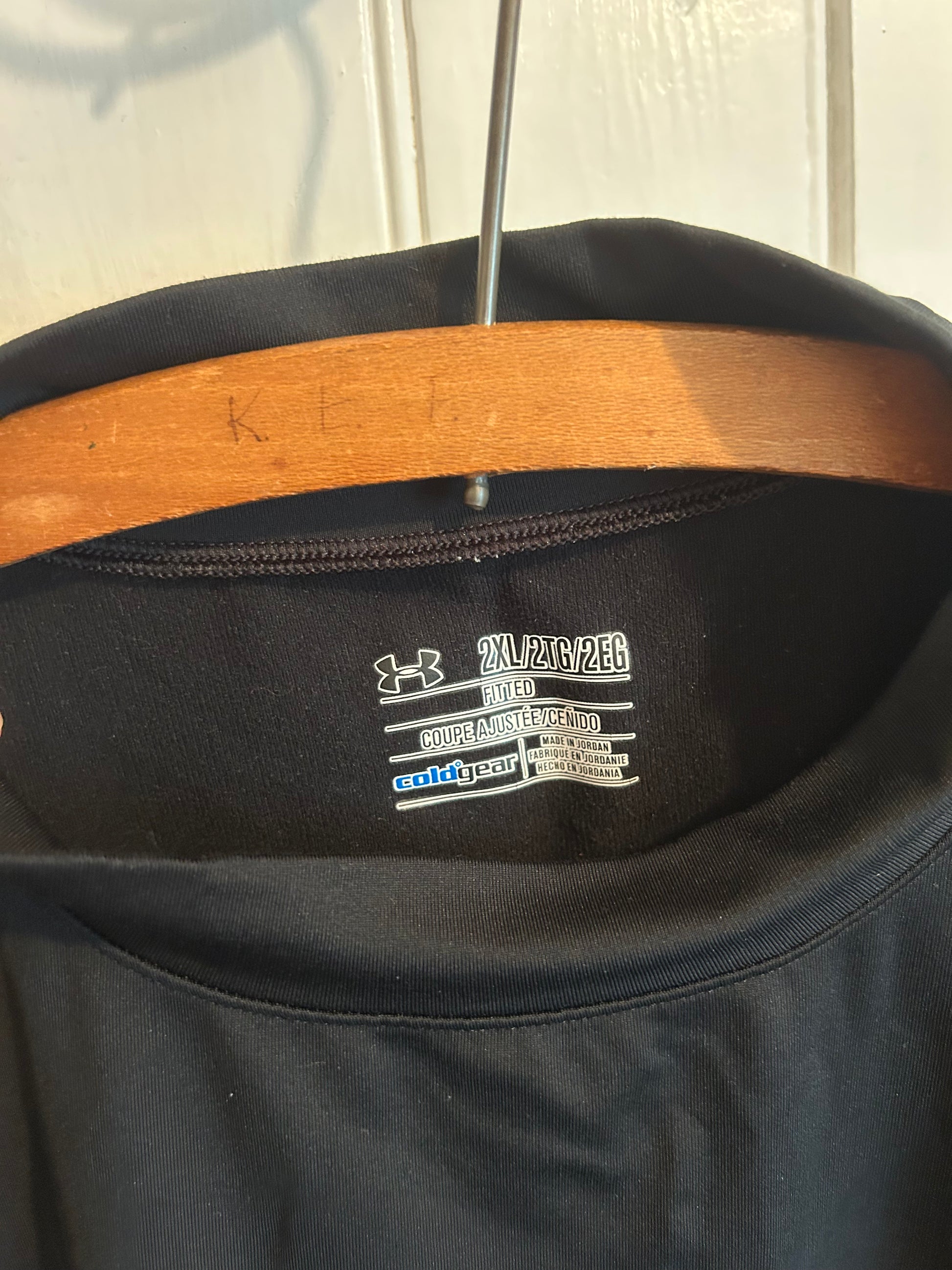 Under armour brand. Long sleeve cold gear thermal top. Black in colour. Size men’s 2x. Brand new condition minus logo is peeling on neck.