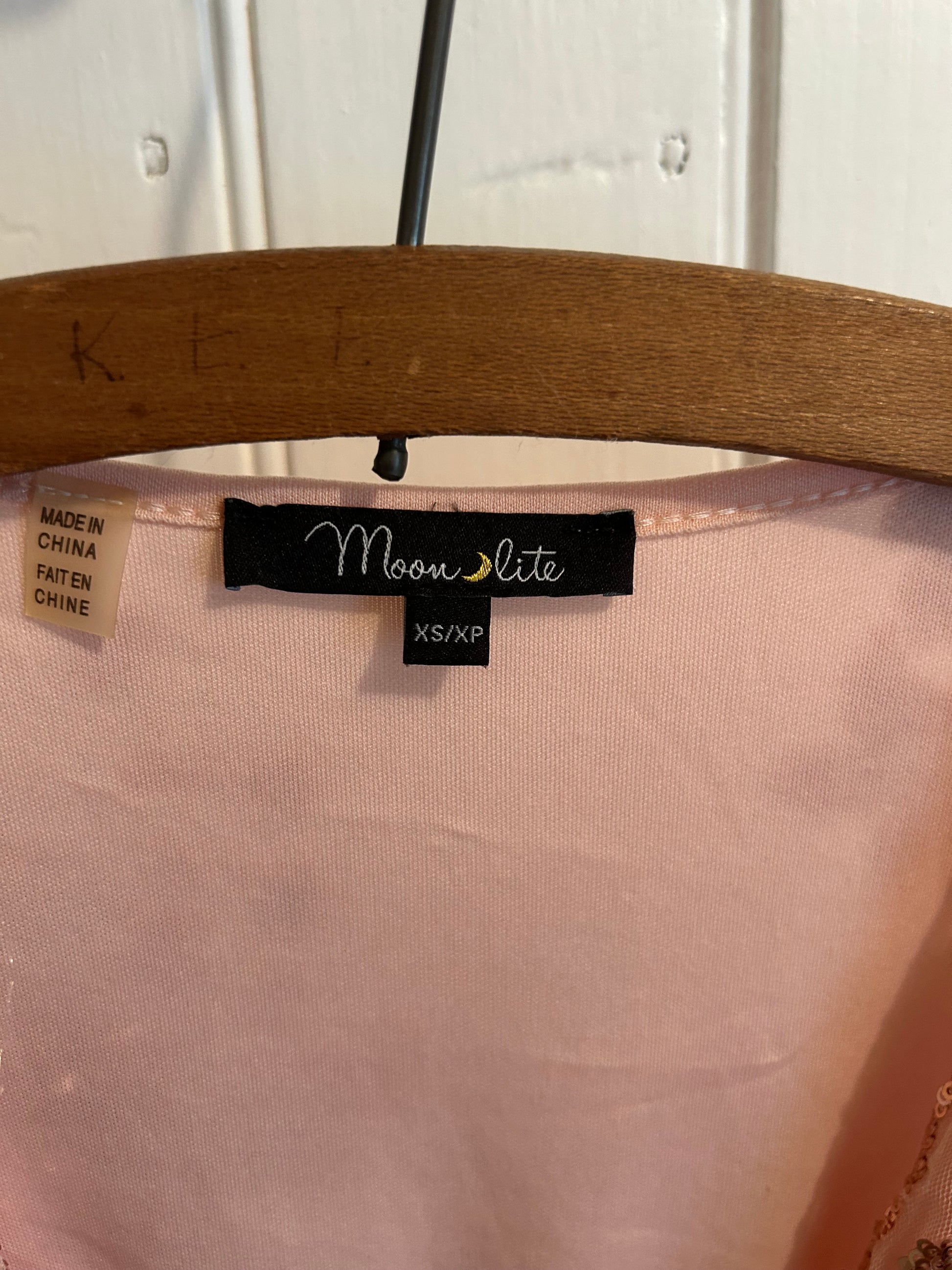 Moonlite brand. Long sleeve vneck shorts romper. Pink with gold sequin floral print. Size xs. Brand new condition