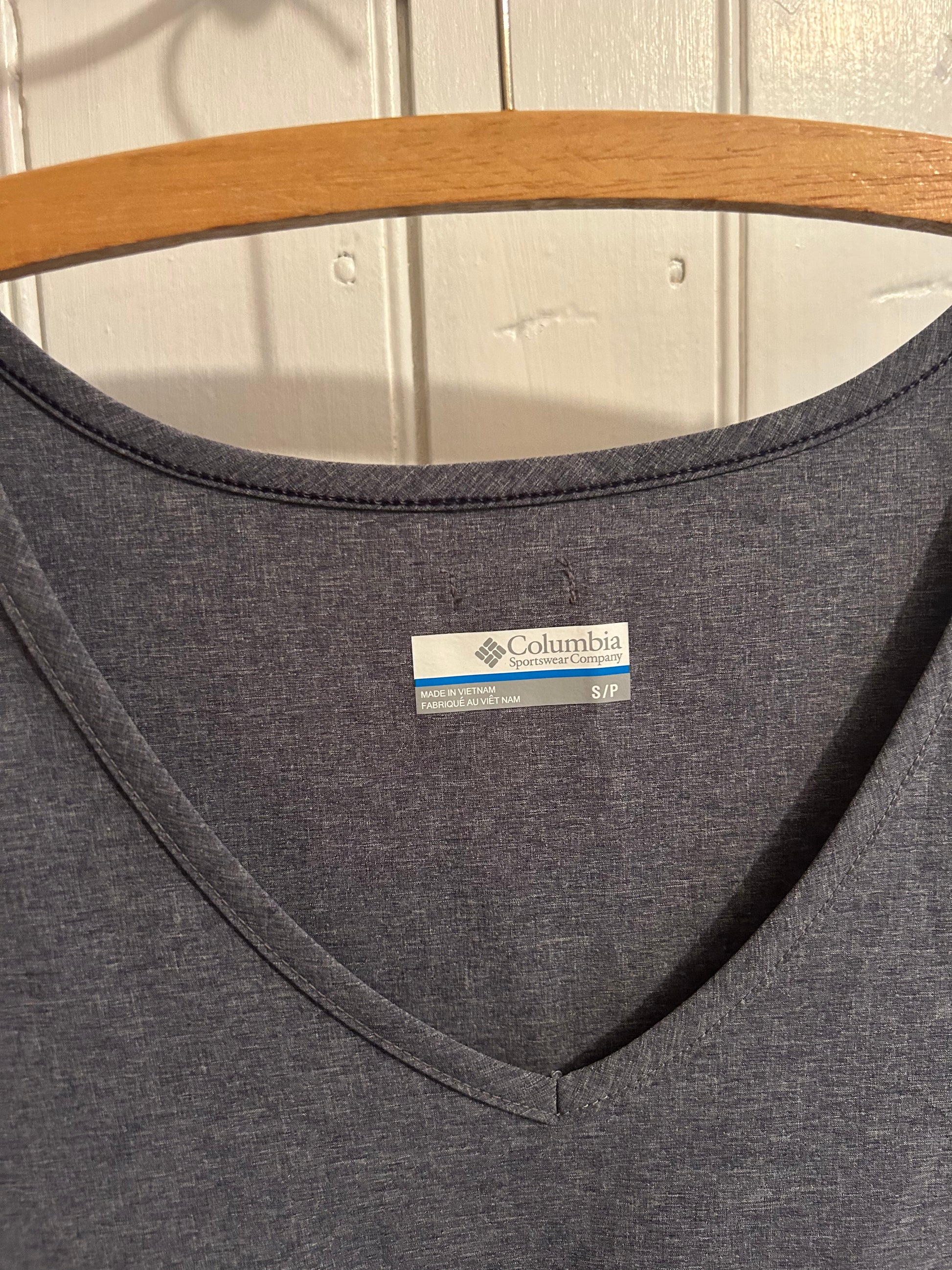 Columbia brand. Sleeveless vneck dress with adjustable side scrunch. Two front pockets. Grey in colour. Size small. Brand new condition
