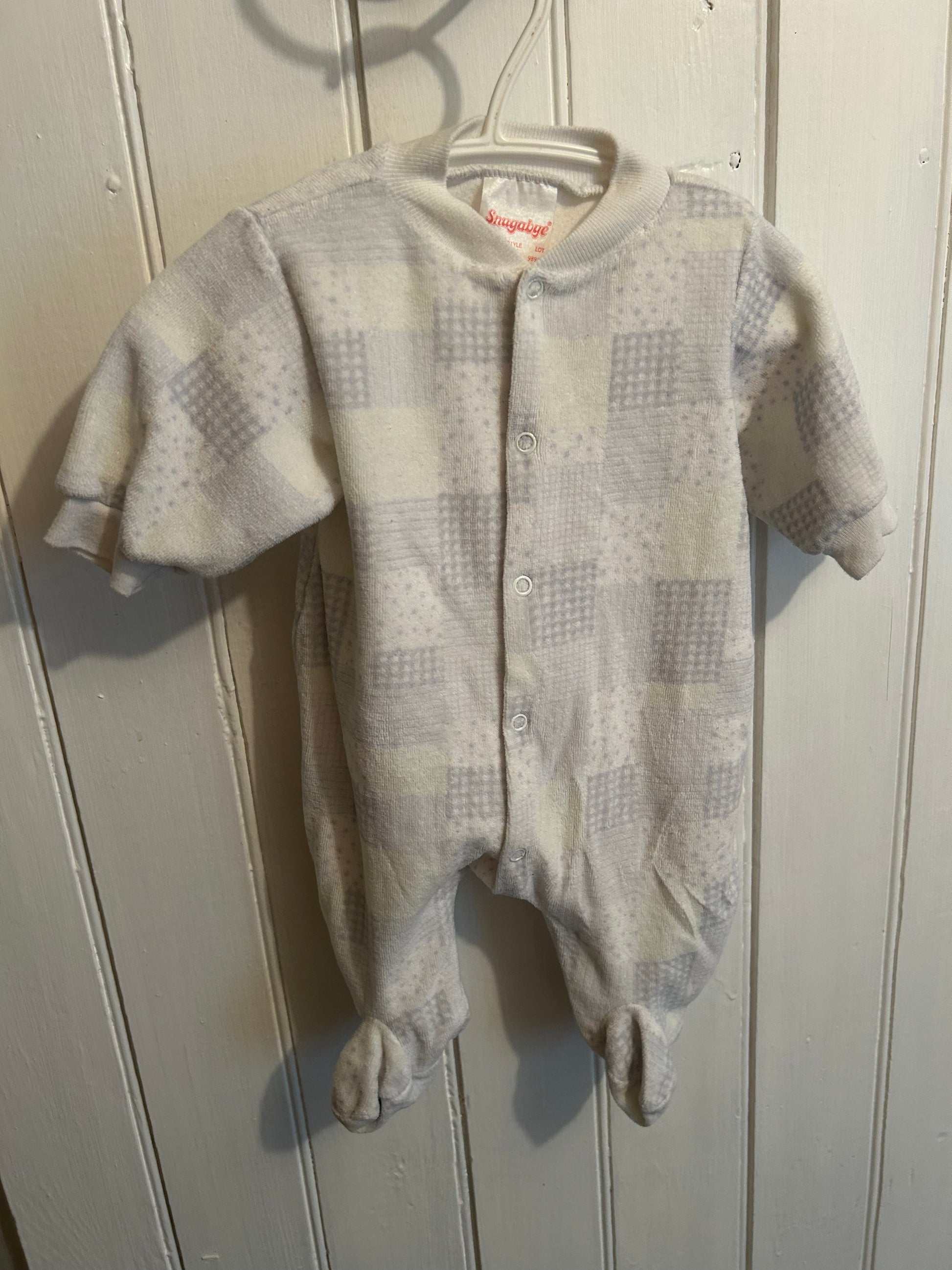 Vintage item. Snugabye brand. Button up fleece sleeper. Light green, grey & white patchwork print. Size 3m. Brand new conditionÂ