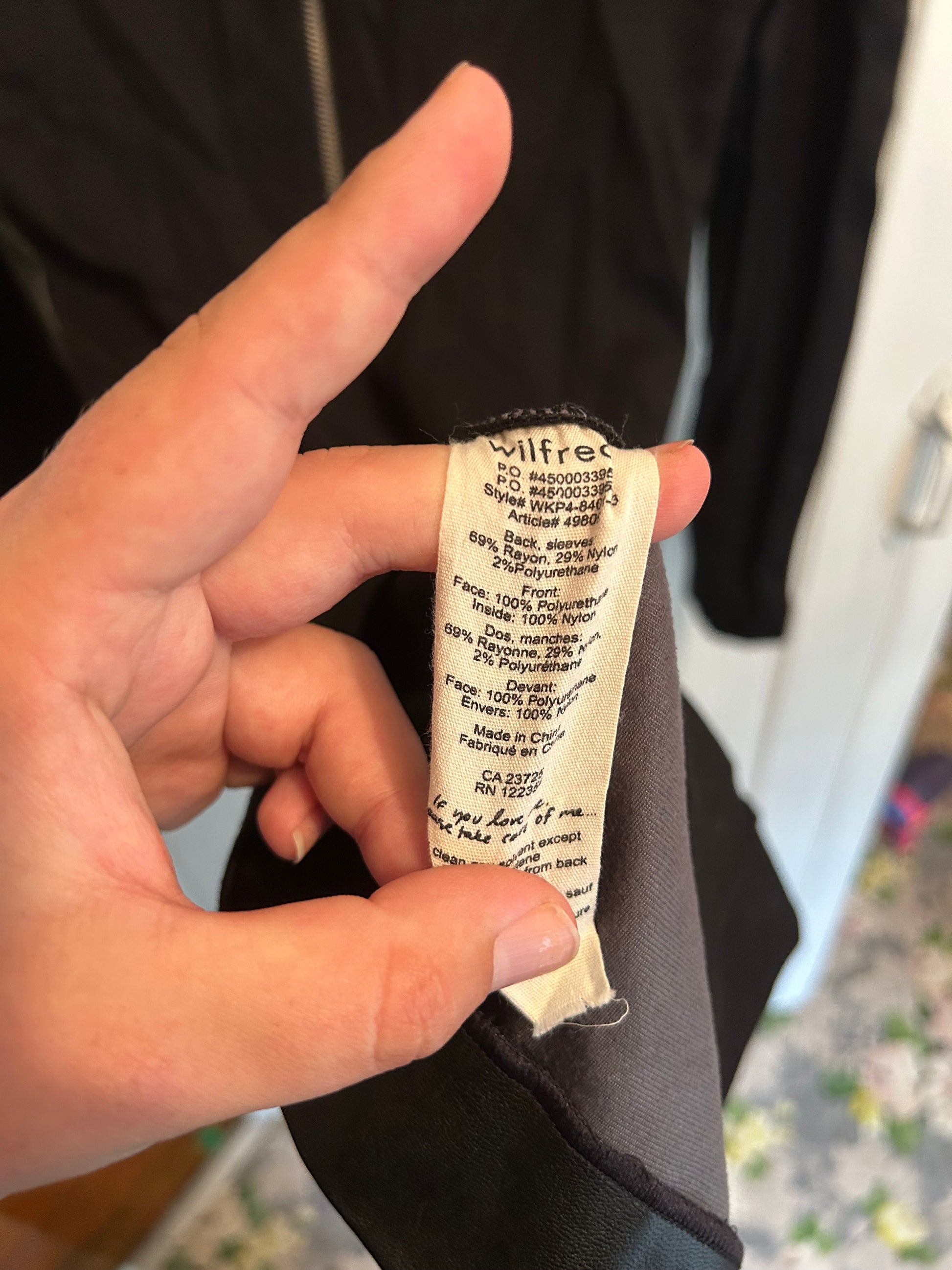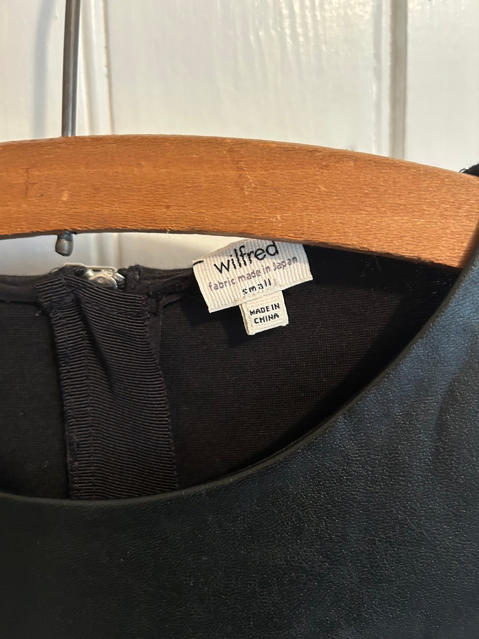 Wilfred for Aritzia brand. Long sleeve bodycon mini dress. Black pleather front with polyester sleeves and back. Size small. Brand new condition