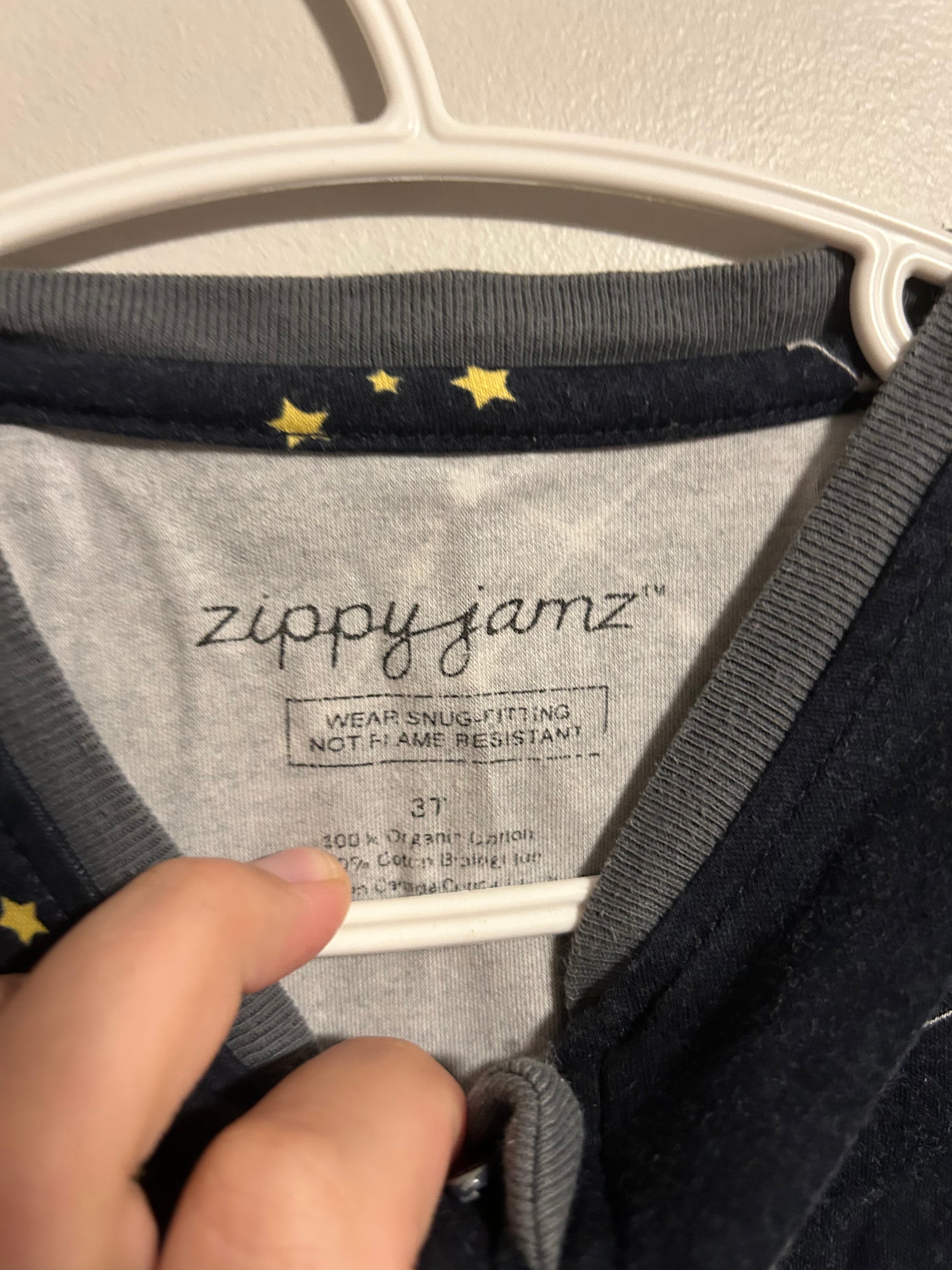 Zippy jams brand. Zip up sleeper, ankle to chest and leg to leg zipper. Open foot. Navy blue with star constellation print. Size 3t. Brand new condition but some wash wear due to the dark colour.